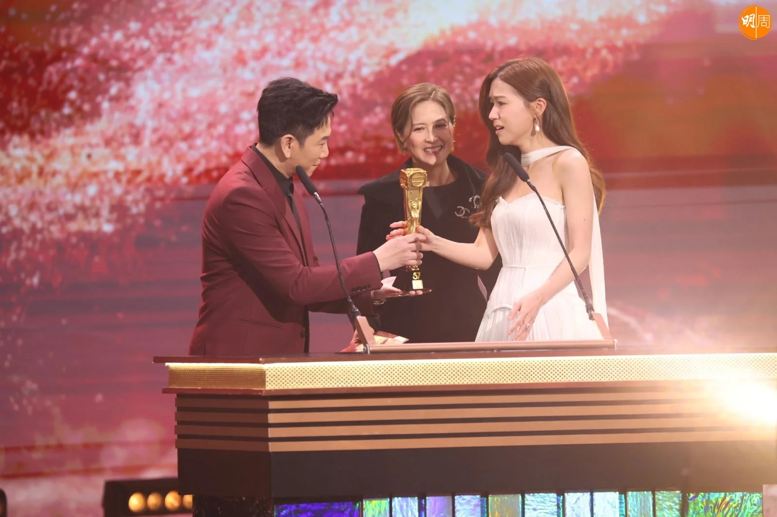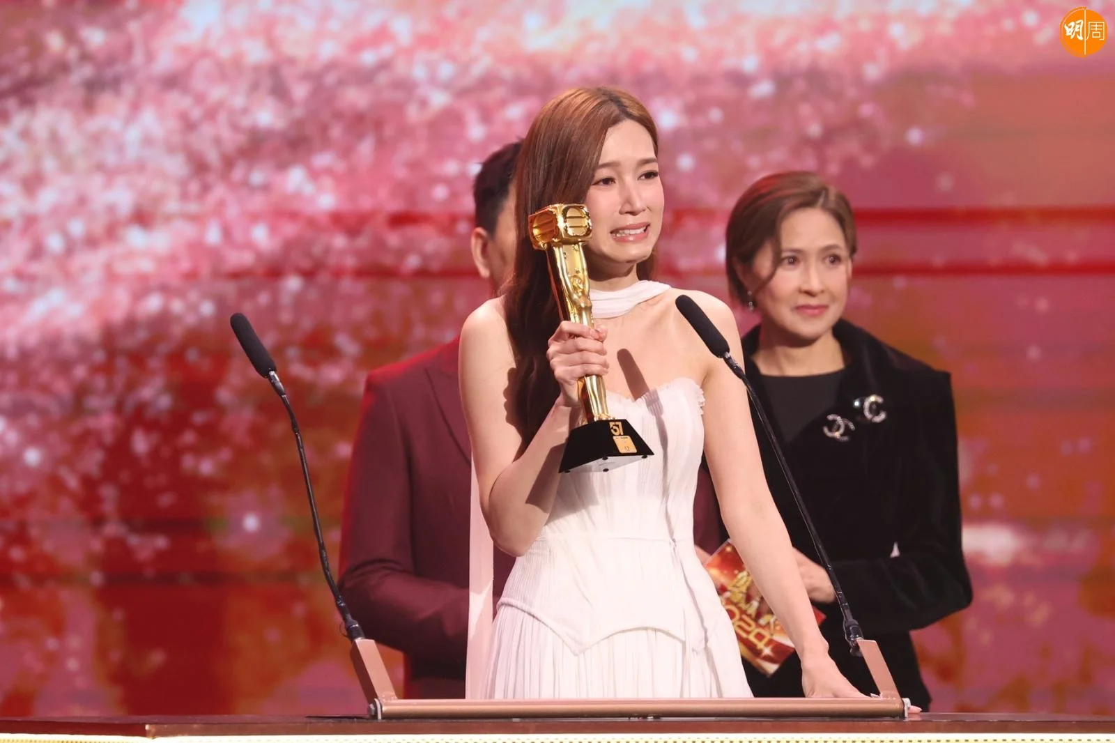 今次都係憑《反黑英雄》贏最佳女配角的傅嘉莉,也說從沒想過獲獎,所以聽到得獎者的名字是自己時,成個人都呆咗,連得獎感言都講得唔好,她說好多謝鍾導,在她低潮時俾好多嘗試佢,叫佢剪短髮做奸人等等唔同角色,令到自己有返自信,她又爆曾經患了抑鬱症,嚴重程度係想放棄自己,因為我好著重事業,但曾經又遇上一些事,我那幾年又冇乜嘢拍,所以真係好多謝鍾導同珍姐,佢哋搵我返公司拍劇。