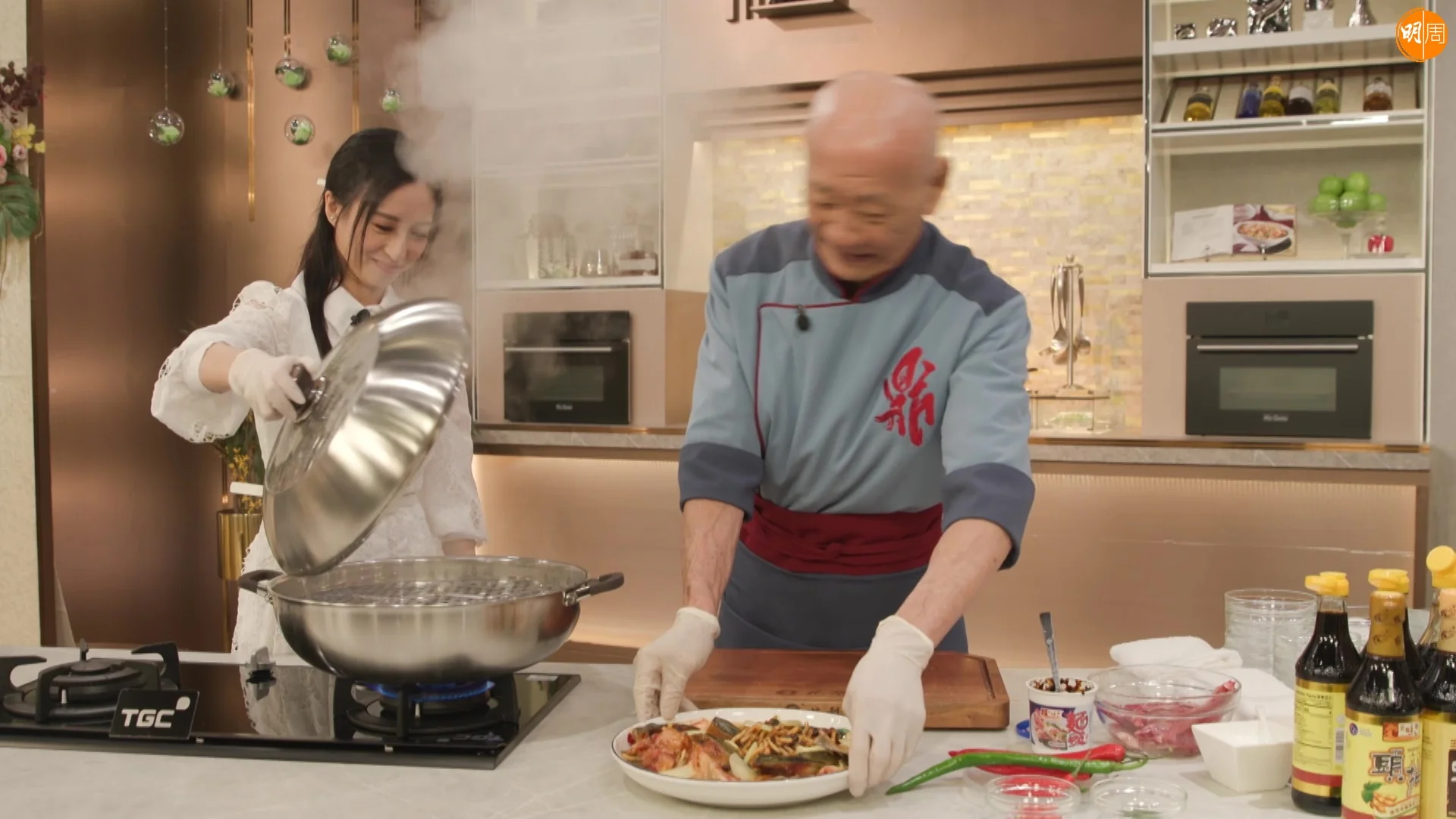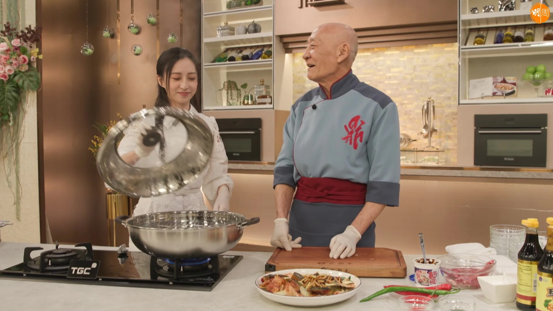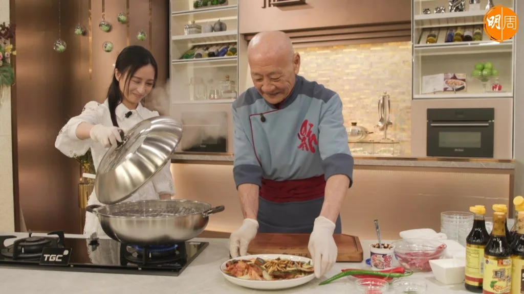 龔嘉欣(Katy)首度主持的飲食節目《在家宴客50道菜》,明天(13日)播出的第八集,Katy不但大膽提醒邵德龍師傅將桂皮說錯成陳皮,令原本嚴肅的廚房充滿歡樂氣氛;在向鼎爺偷師學煮鼎爺家傳菜「酸筍麵醬蒸魚頭」時,因為揭蓋時間不準,令鼎爺險被超熱水蒸氣灼到,幸好身手敏捷的鼎爺秒速閃開,而嘉欣則搞笑地「自保」,說道:「邊個叫你咁快過嚟啫!」鼎爺聞言沒好氣地笑了一下後,即耐心教導嘉欣如何在安全情況下打開鑊蓋,盡顯疼錫之情。Katy在過去的7集,都與六位大廚相處樂也融融、全程有說有笑,不過與鼎爺似乎份外熟稔。
