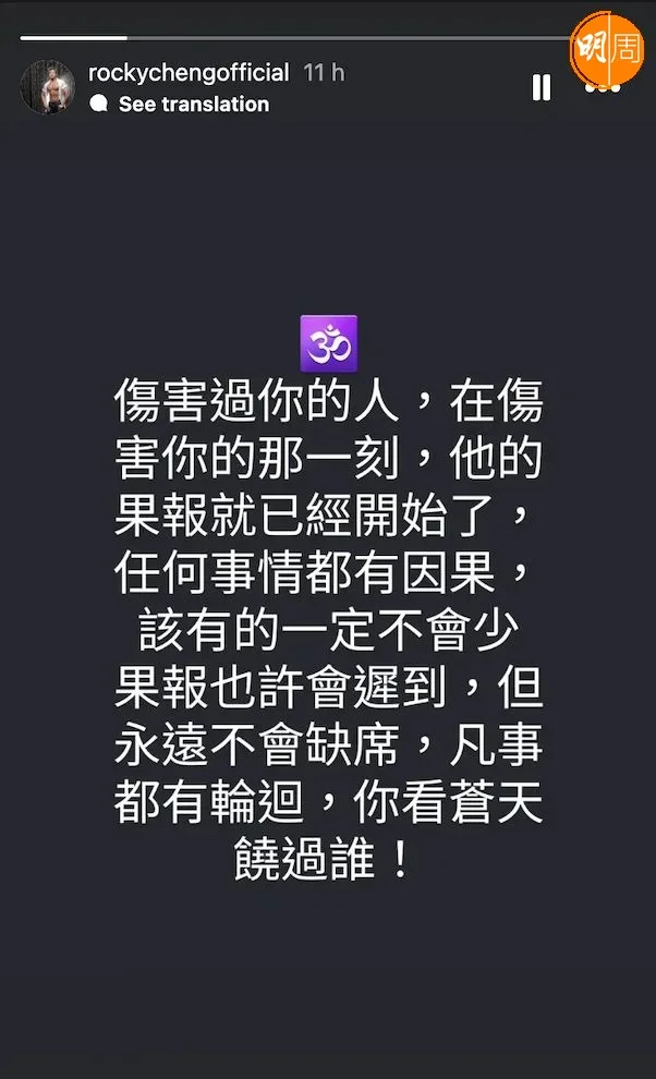 前港男鄭健樂(Rocky)與崔碧珈的「父女戀」緋聞,在短短一個多月內由熱轉冷。近日,Rocky更被貼街招追債,他隨即在社交平台發文,以一番「因果論」似在回應紛擾:「傷害過你的人,在傷害你的那一刻,他的果報就已經開始了,任何事情都有因果,該有的一定不會少。果報也許會遲到,但永遠不會缺席,凡事都有輪迴,你看蒼天饒過誰。」