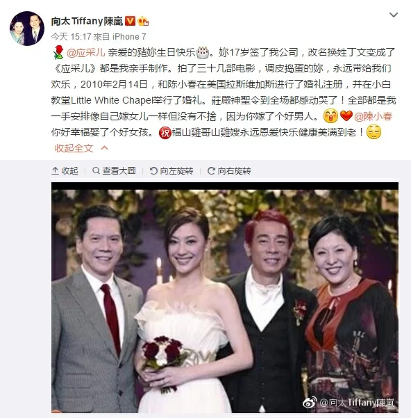 不過除了老公送上祝福之外,又點少得應采兒的大恩人「向太」陳嵐呢?向太今日在微博好開心的表示︰「妳17歲簽了我公司,改名換姓丁文變成了《應采兒》都是我親手製作。拍了三十幾部電影,調皮搗蛋的妳,永遠帶給我們歡樂,2010年2月14日,和陳小春在美國拉斯維加斯進行了婚禮註冊,並在小白教堂Little White Chapel舉行了婚禮。莊嚴神聖令到全場都感動哭了!全部都是我一手安排像自己嫁女兒一樣,但沒有不捨,因為你嫁了個好男人。陳小春,你好幸福娶了個好女孩。」此言一出,的確感動很多網民,「我也喜歡應采兒,向太向生好有眼光!」