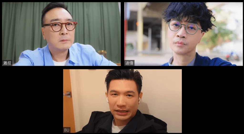 近日他們宣佈再度合體,三人聚首一堂,當然有新搞作,不過十年時間真是滄海桑田,三人由昔日少年,變成人到中年,三位阿叔就在100毛全新節目《三叔公園》,同大家再次訴說心中情。雖然三人已到中年,但搞gag實力仍然不減,日前宣傳片就盡顯功架,先以Facetime切入,各人先揶揄一番,其後阿Bu模仿偽ABC說話口吻邀請二人再度合作,中英夾雜,you know前you know後,又即時中英翻譯,認真騎呢,迪偉接着回應唔玩UNO,直線抽擊這種說話口吻,順便拒絕,鏡頭一轉,阿Bu被老婆陳柏寧(利君牙)責備不夠真誠,應直接道明掛念灘叔、迪偉二人,故想趁十周年再跟大家做節目,阿Bu也表示掛念聽眾,灘叔與余迪偉深思熟慮後,最後答應重組。
