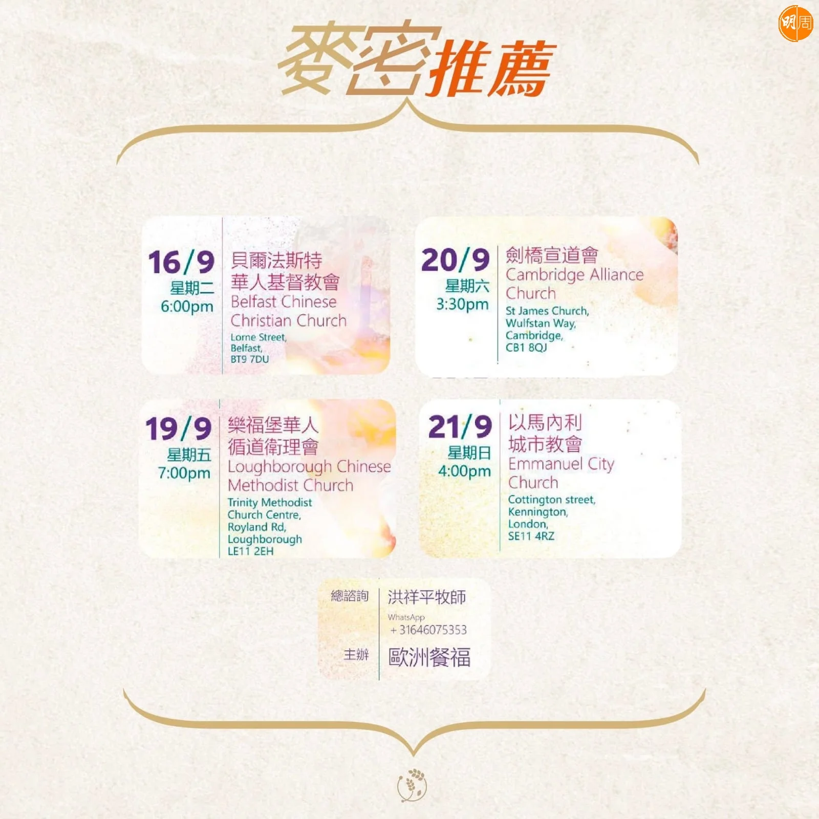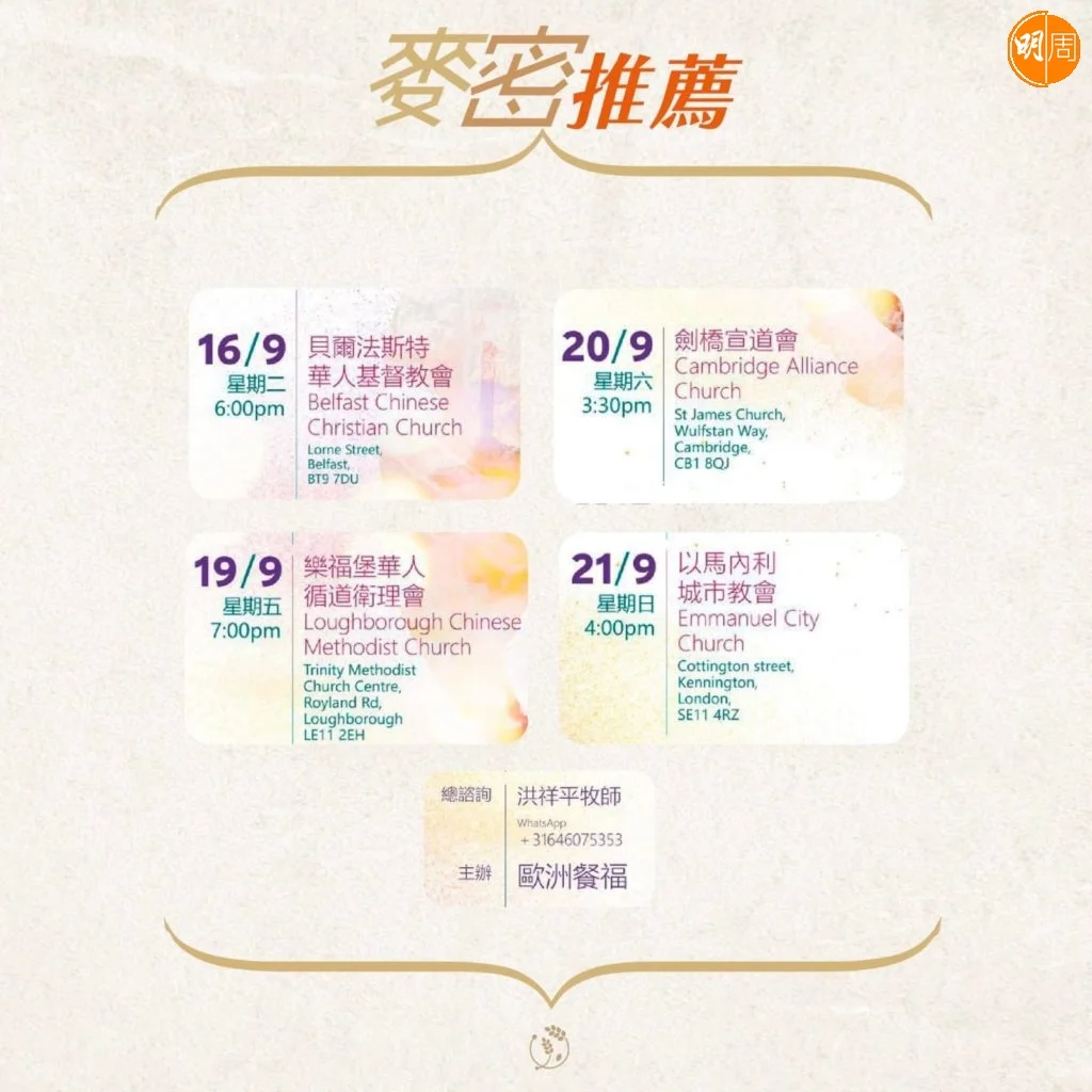 今次Mag去英國,總共出席了四個佈道會,包括9月16日的貝爾法斯特華人基督教會、9月19日的樂齡堡華人循道衛理會、9月20日的劍橋宣道會,以及9月21日的以馬內利城市教會。