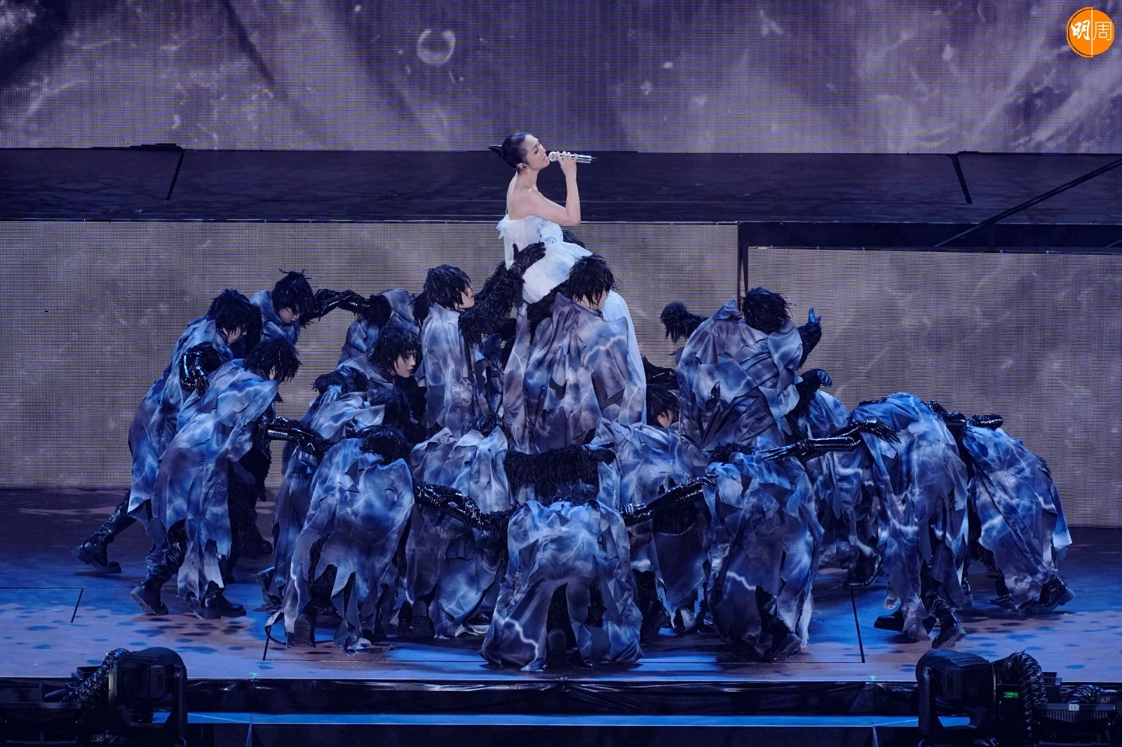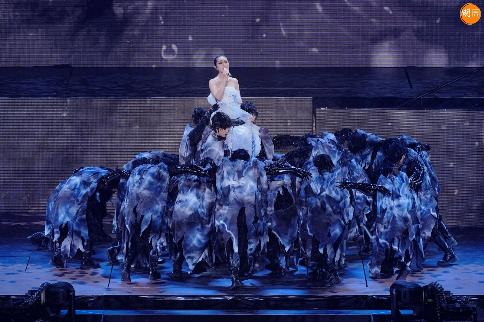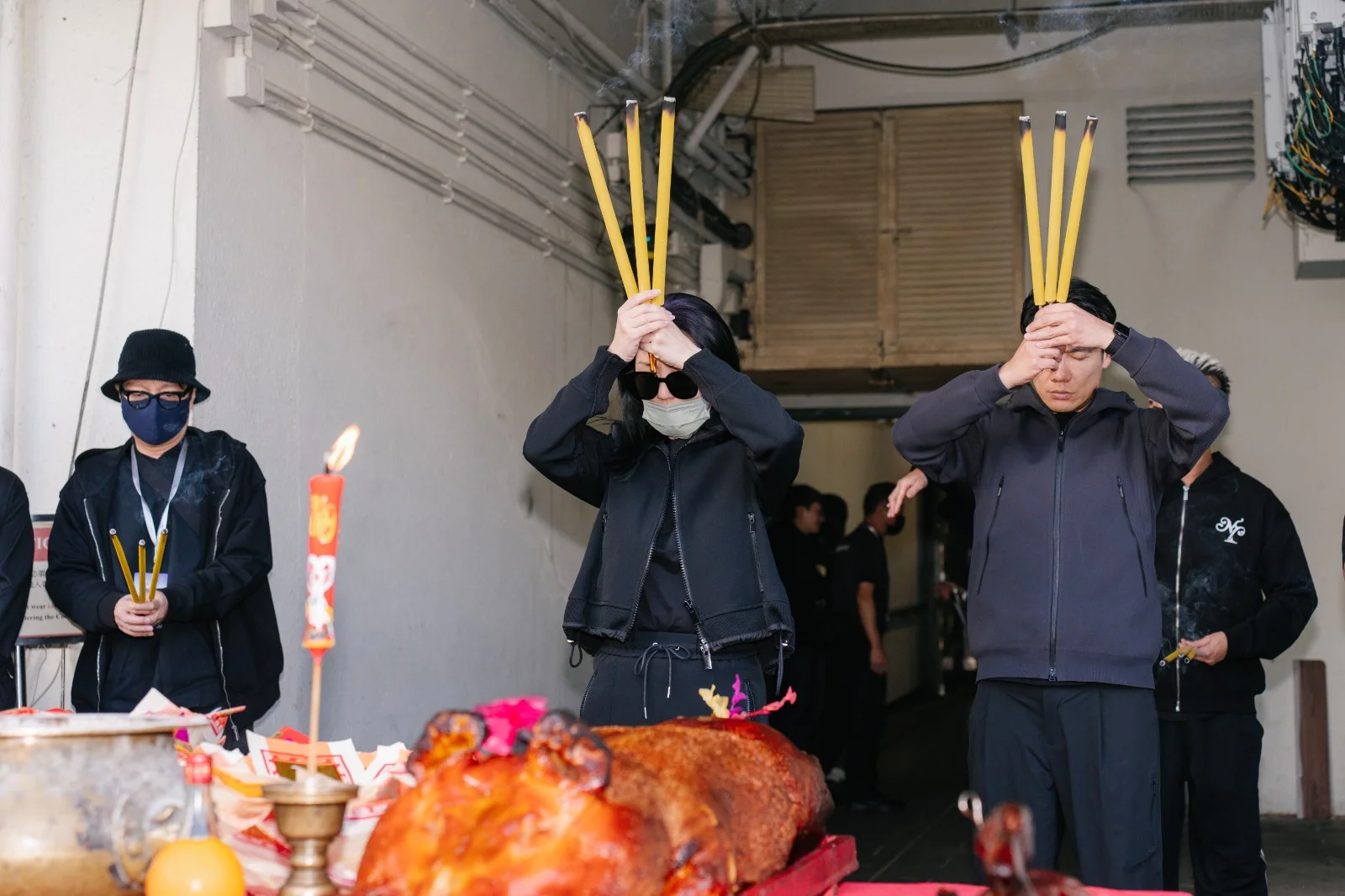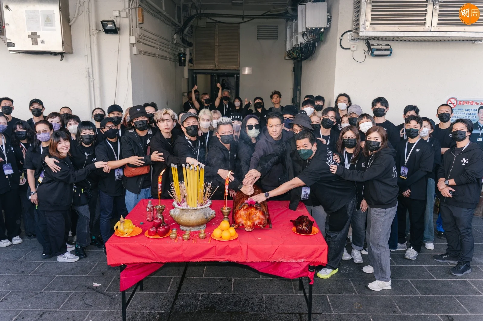 下午的拜神儀式上,全體工作人員自發穿上黑色服裝,以樸素姿態呼應全港連日來的沉痛心情。這份尊重延續至舞台——樂手們一致換上黑色演出服;千嬅的演出造型也連夜調整,捨棄鮮艷,回歸沉靜。其中一件原為紅色的戰袍,經團隊通宵改製,化作黑白金三色,在燈光下低調閃耀。