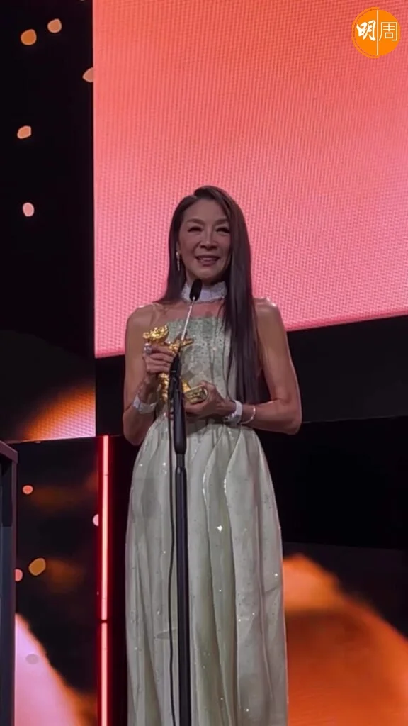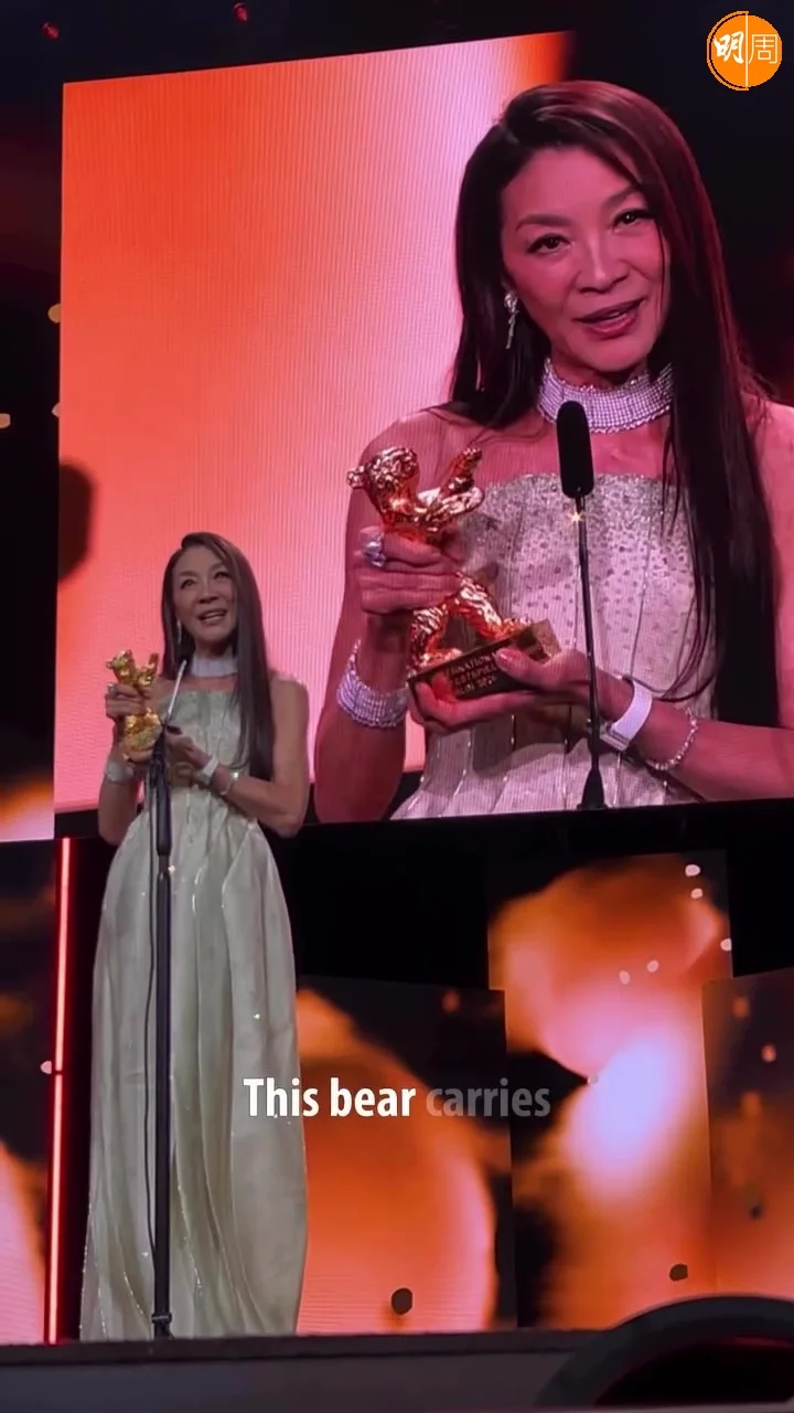 Michelle在台上發表得獎感言:「『終身成就』這個詞意義重大,聽起來像一個結論,但我更願意把它看作是一個停頓、一個喘息及回顧過去的機會,然後再繼續前進。當然,要小心謹慎,以免有人把這頭熊取回。」