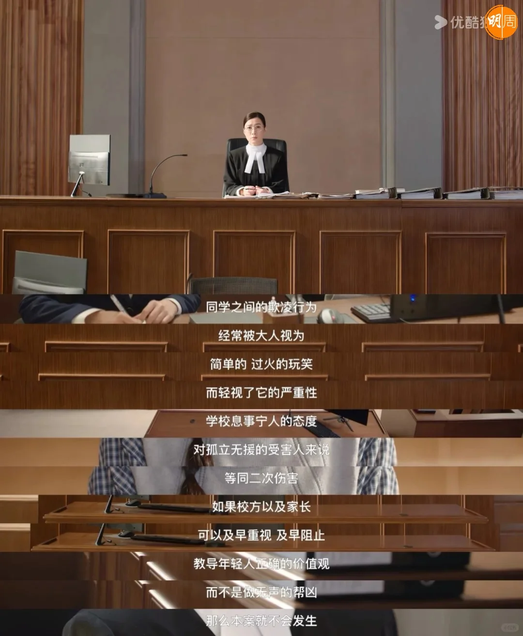 「校園霸凌案」,言官對飾演上司「洪官」洪思義的許紹雄說:「如果你真的因為她們是孩子,所以無條件相信她們的話,那你真的比孩子還天真!」再就學校和家長的態度說: