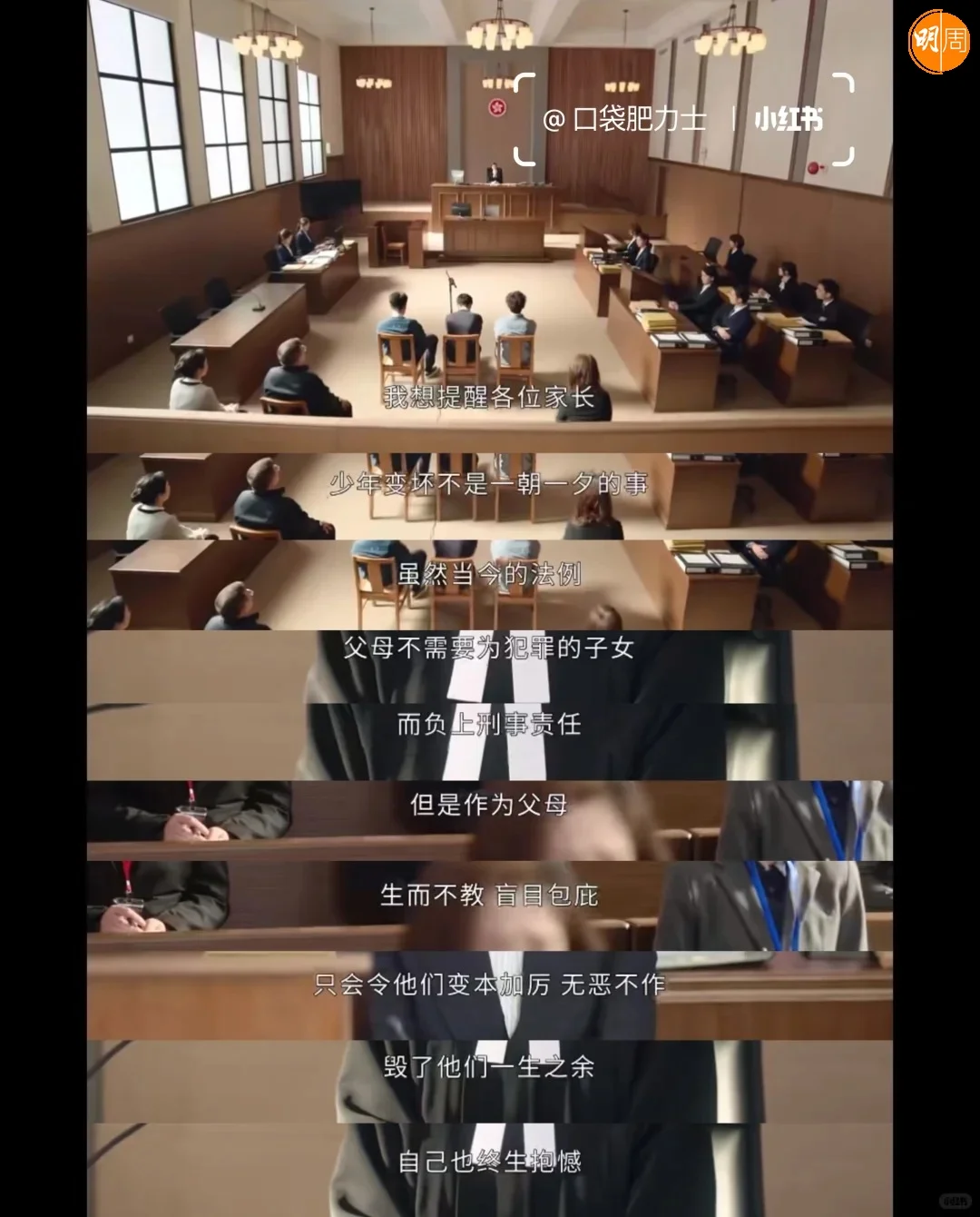 然後有「富家子放火殺人案」,父親借家裏的權勢金錢想要毁滅犯罪證據,言官:「既然父母不教,就由法庭幫你教」。