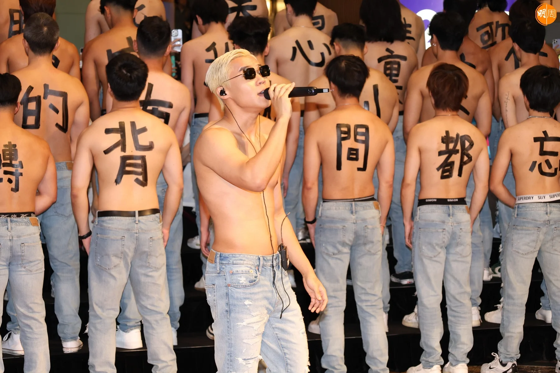 Gareth. T(湯令山)昨晚(30日)在旺角快閃宣傳新歌《用背脊唱情歌》,招募了53位半祼男士,每人在背脊貼上一個字,擺出人肉歌詞陣,他唱了兩次新歌及最後使出「令山轉」。被問到歌曲受歡迎,可有信心「轉」上紅館?他表示會盡力,雖然離紅館好像有點遠,最重要是順其自然。