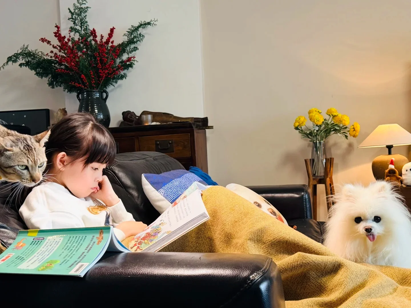 囡囡有愛貓與狗狗陪伴,靜靜看書。
