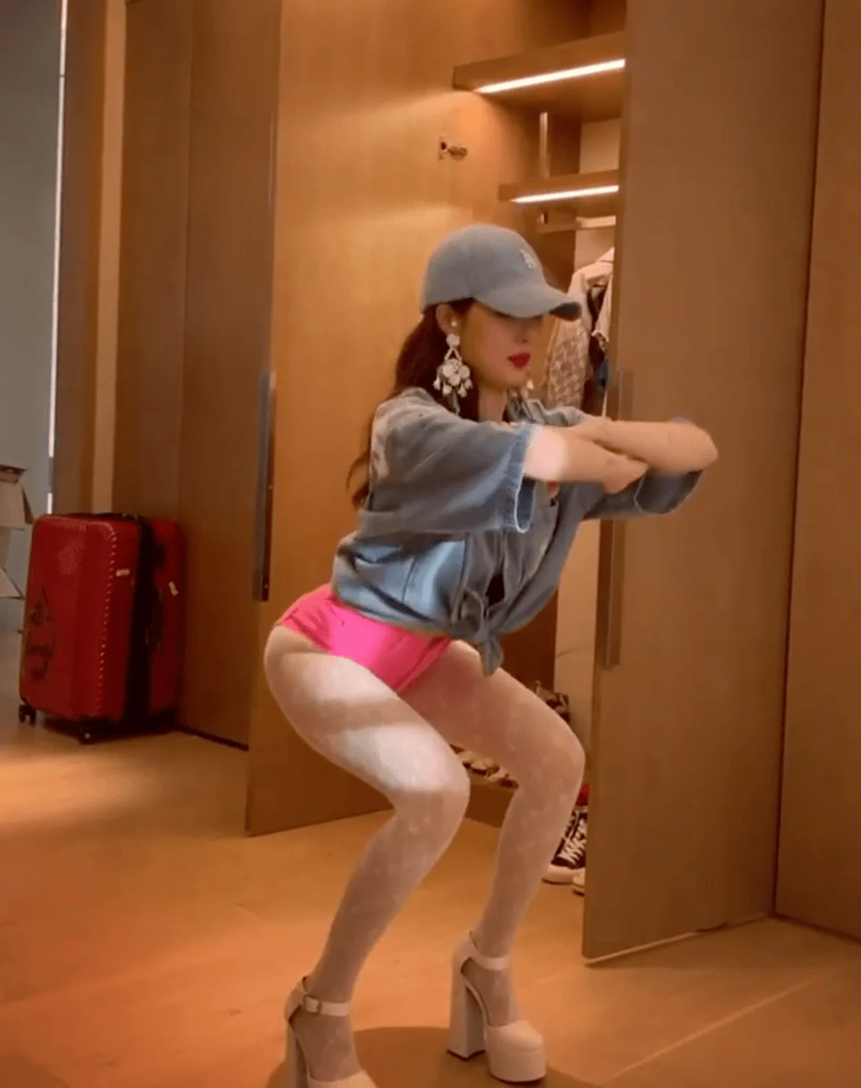 而新近又上載短片示範深蹲動作,不過這次並非在健身室,她穿着超高踭鞋、白絲襪及超短褲在房間內示範,一邊做一邊面露笑容,這個難度甚高的加強版深蹲,女士可能會睇到嘩嘩聲,男士則要忙於去搵紙巾抹鼻血呢!