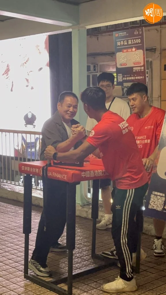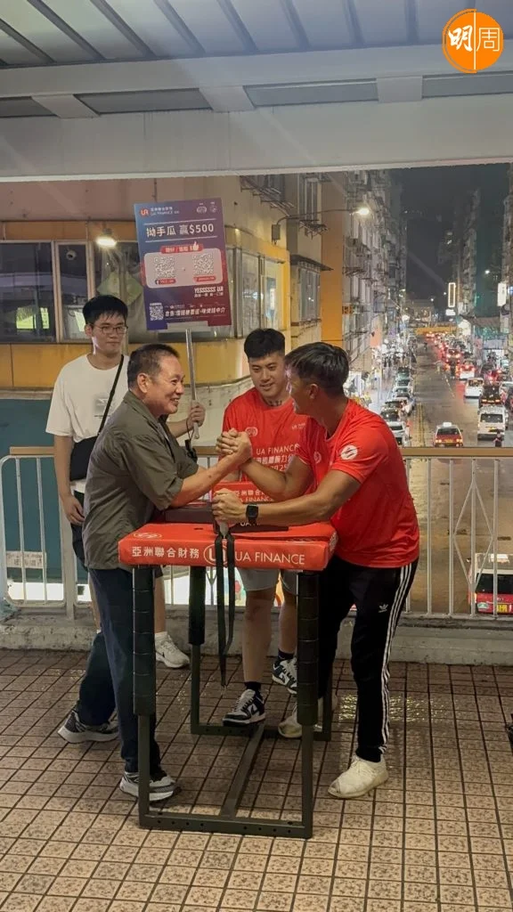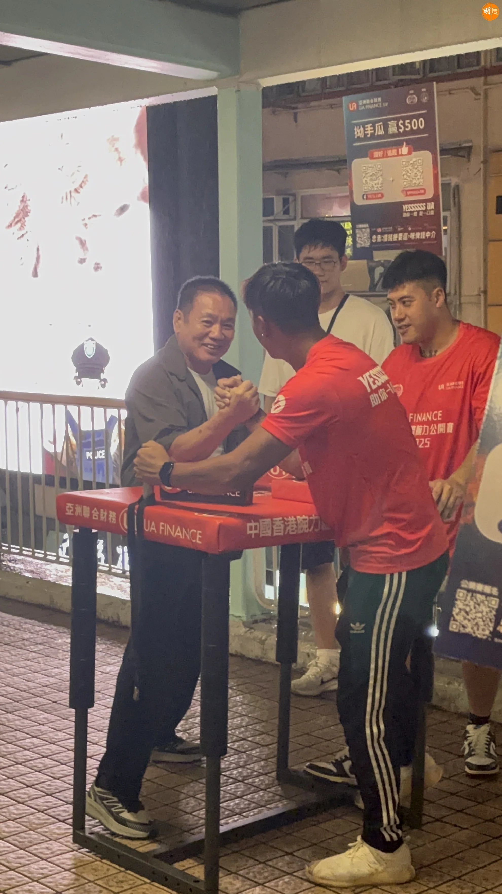 昨晚(20日),羅莽與太太經過旺角行人天橋時被巧遇,即獲「香港國際腕力公開賽街頭挑戰賽」的腕總(中國香港腕力運動總會)代表邀請挑戰,羅師遇「武林高手」即笑到「四萬咁口」,馬上答應落場作賽,精神奕奕大晒「神臂威力」,吸引大批巿民圍觀,為他吶喊助威,非常熱鬧!老而彌堅的羅莽亦不負眾望,經過一輪比試後,成功拗贏年輕力壯的腕總代表,贏得500元現金獎,可謂寶刀未老!