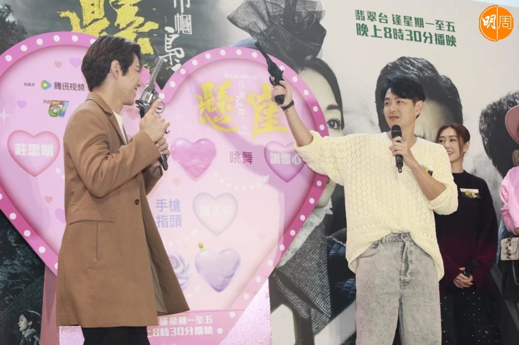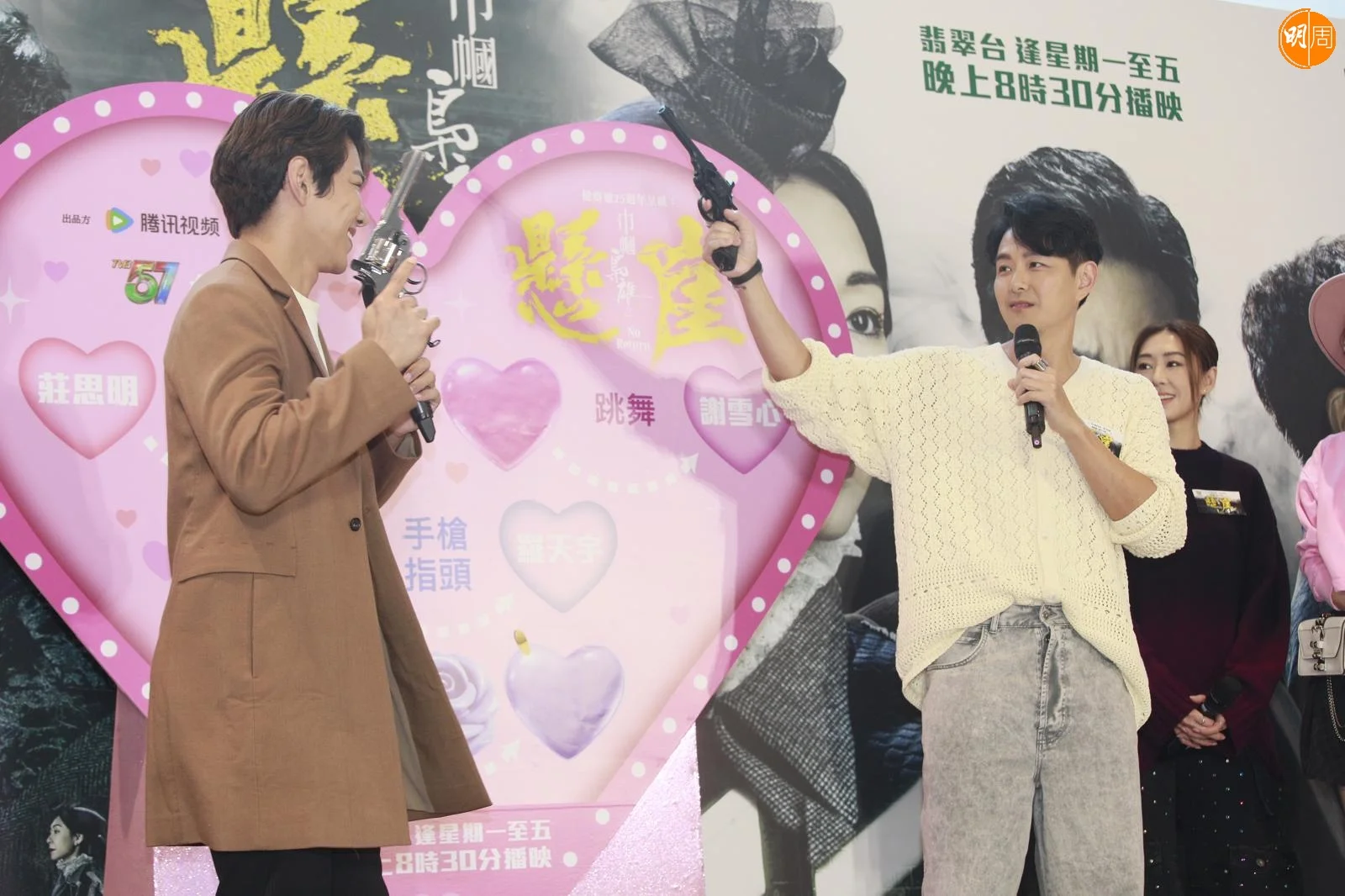 胡定欣、蕭正楠、羅天宇、羅毓儀、謝雪心、康華、海俊傑等昨日(9日)為無綫台慶劇《巾幗梟雄之懸崖》宣傳。定欣提到拍攝向黎耀祥表白後跌落水的場口是親自上陣,事前在手掌位貼上膠紙,以免擦傷,幸而後來順利拍攝完成。在現實生活中,定欣自言不會主動表白,喜歡彼此互相暗示,「大家行前少少,唔使講得太清楚,就好似七爺因為得到柴十七關心先會行前一步。現實生活中咁樣做就唔會錯,我盡量唔畀自己出錯。」黎耀祥飾演的「柴十七」後來將會在一塊稻田上向「七爺」定欣表白,定欣回想起拍攝《公公出宮》時,與黎耀祥同樣在稻田上取景,坦言感覺奇妙,「真係緣分,兩套劇好似互相呼應。」