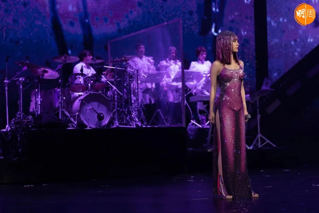 Jolin昨晚首次以「裸鑽尤物」造型示人,超貼身的紫紅色高叉裙,纖腰與美腿盡現人前,性感撩人,胸前更是「露兩點」,尺度極大!原來她胸前的「兩點」是造型師特意以鑽石點綴,讓人想入非非,Jolin也不禁問觀眾:「這樣唱抒情歌會讓人不專心嗎?」她又續說:「這是我出道以來尺度最大的一套,開玩笑的,其實這對我而言像是一塊蛋糕。」
