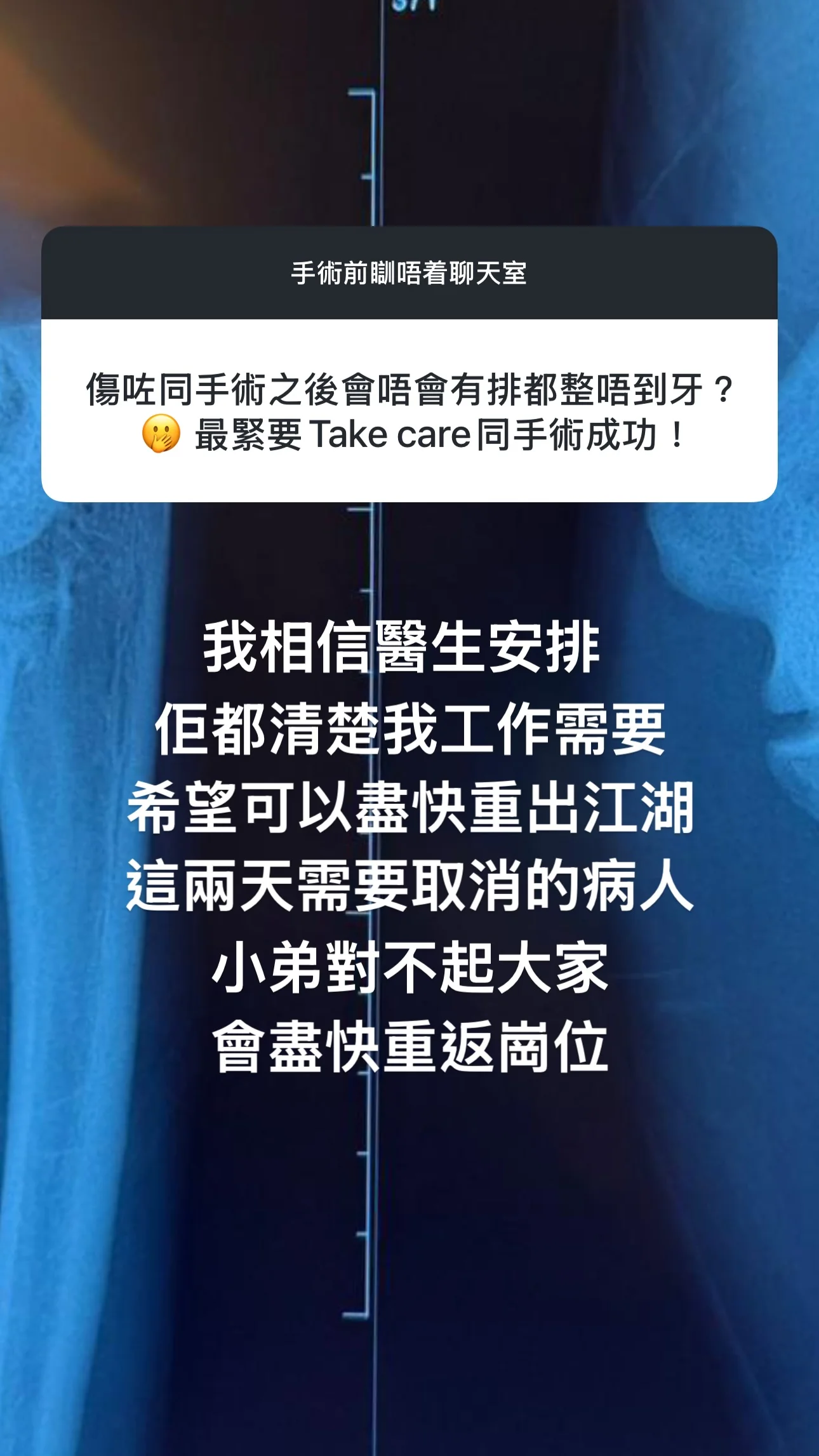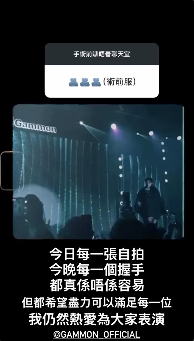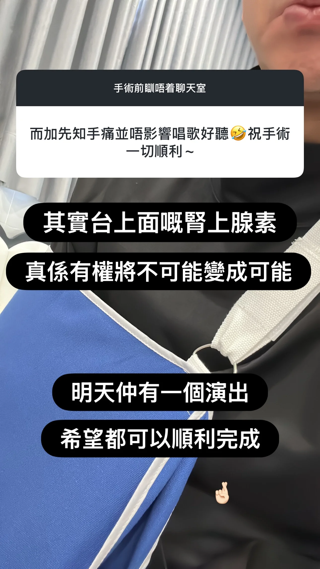 Alfred透露其實今晚就要做手術,今日亦思考了很久如何呈現演出:「與其喺屋企懷疑人生,我寧願做啲我鍾意嘅事,分享一吓正能量,亦接收吓大家嘅energy,仲有好窩心嘅『集氣』,我相信聽日手術一定會好順利﹗正所謂『別忘掉原是靠堅持醫好每個傷患』,大家等我滿血復活﹗」