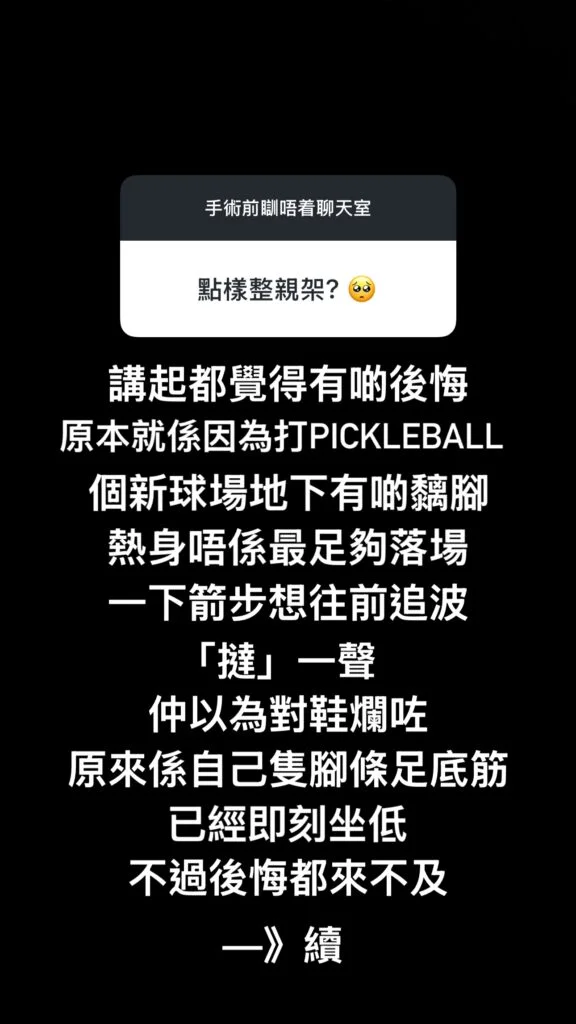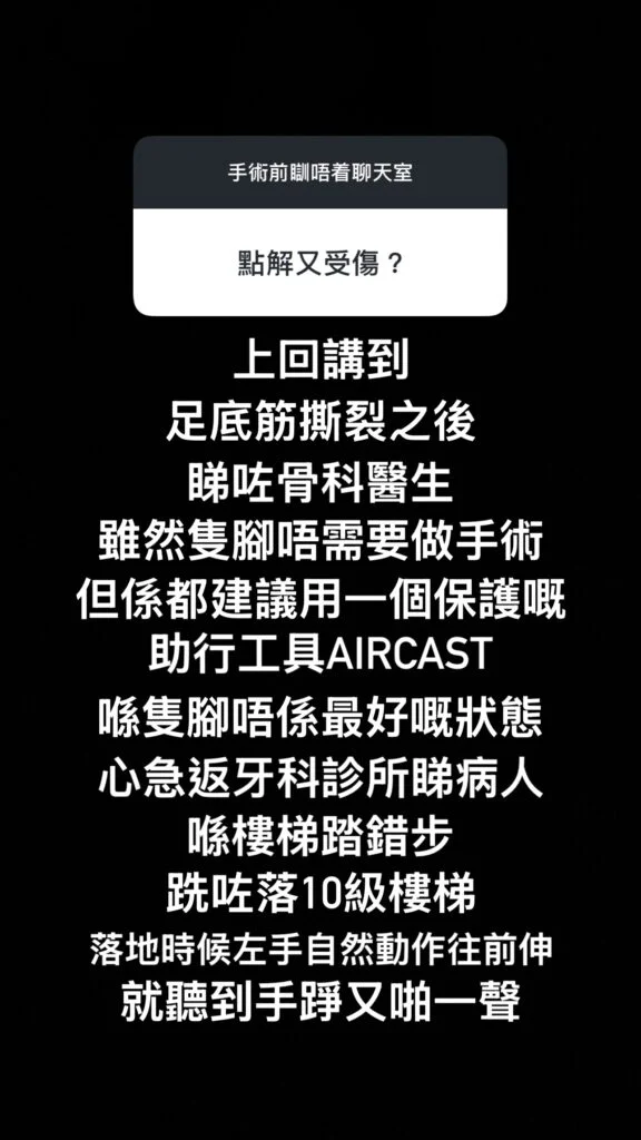 談及受傷經過,Alfred詳細交代了事件始末:「講起都覺得有啲後悔,原本就係因為打PICKLEBALL,個新球場地下有啲黐腳,熱身唔係最足夠落場,一下箭步想往前追波。『撻』一聲仲以為對鞋爛咗,原來係自己隻腳條足底筋,已經即刻坐低。不過後悔都來不及⋯⋯足底筋撕裂之後,睇咗骨科醫生,雖然隻腳唔需要做手術,但係都建議用一個保護嘅助行工具AIRCAST,喺隻腳唔係最好嘅狀態,心急返牙科診所睇病人,喺樓梯踏錯步,跣咗落10級樓梯,落地時候左手自然動作往前伸,就聽到手踭又啪一聲。」