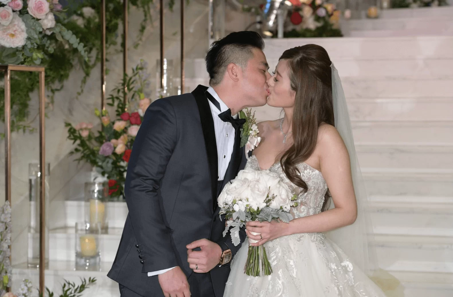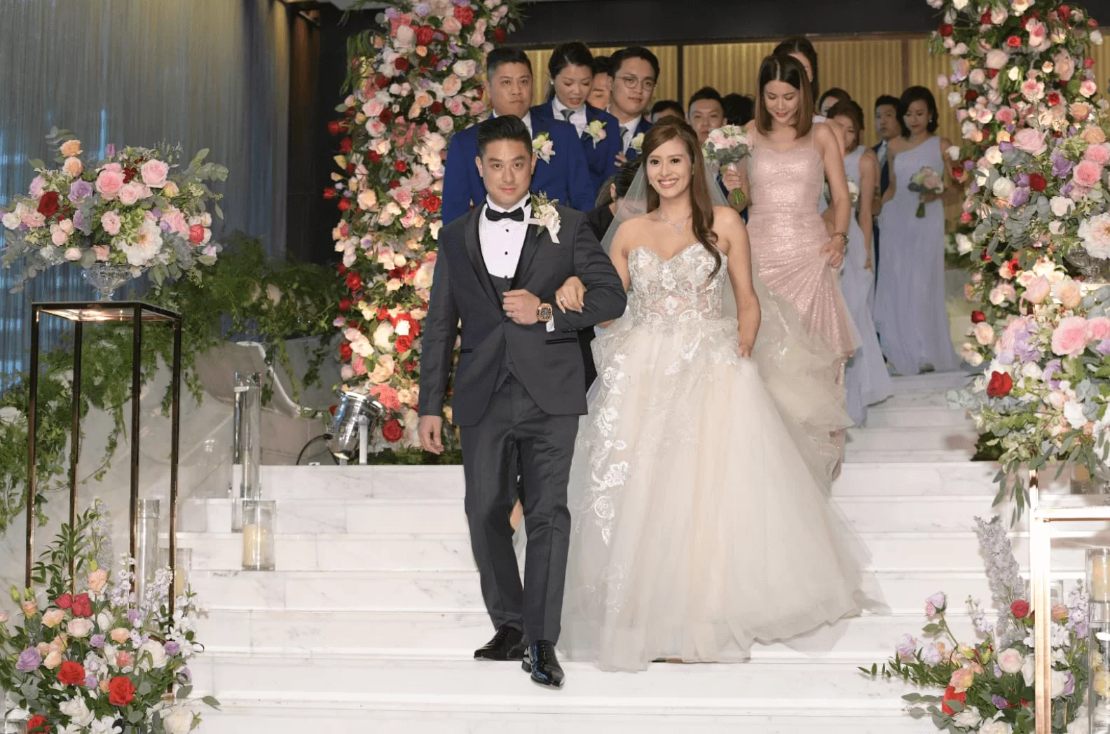 Whitney披上一身華麗婚紗進場,打扮得高貴動人。她全程挽着老公的手臂,露出幸福的笑容。一對新人又於賓客面前甜蜜咀嘴,引起全場歡呼。
