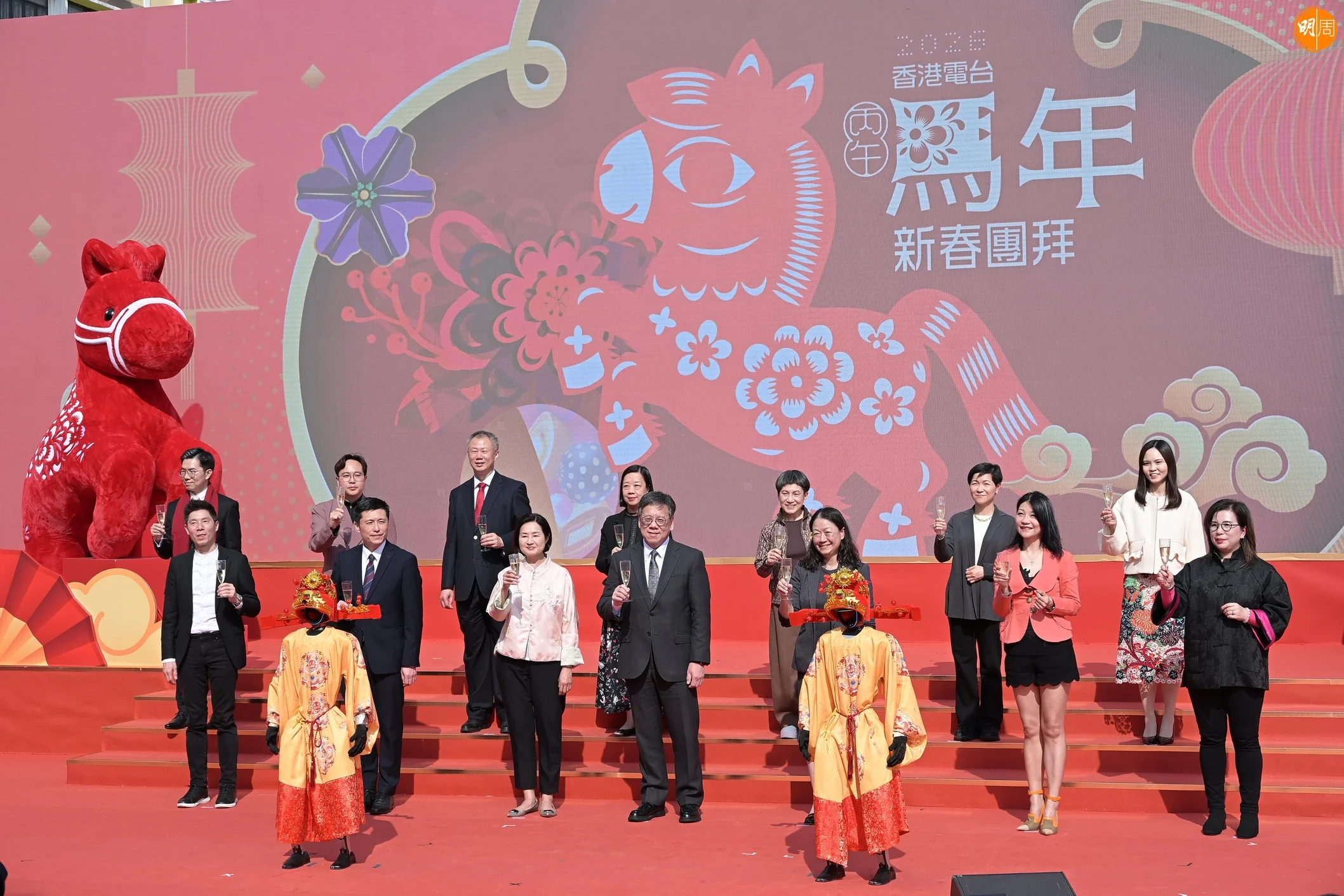 香港電台昨日(23日)舉行新春團拜,商務及經濟發展局局長丘應樺、廣播處長關婉儀,各大傳媒機構高層、鄺美雲、張馳豪、詹天文、馮熙燮、柯雨霏、胡子貝、張進翹等出席。