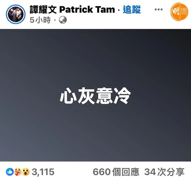 其後譚耀文突然刪文,並改發恭喜林家熙的Post:「恭喜阿仔 (石頭)#林家熙,戥你超開心,你的汗水沒有白費」。