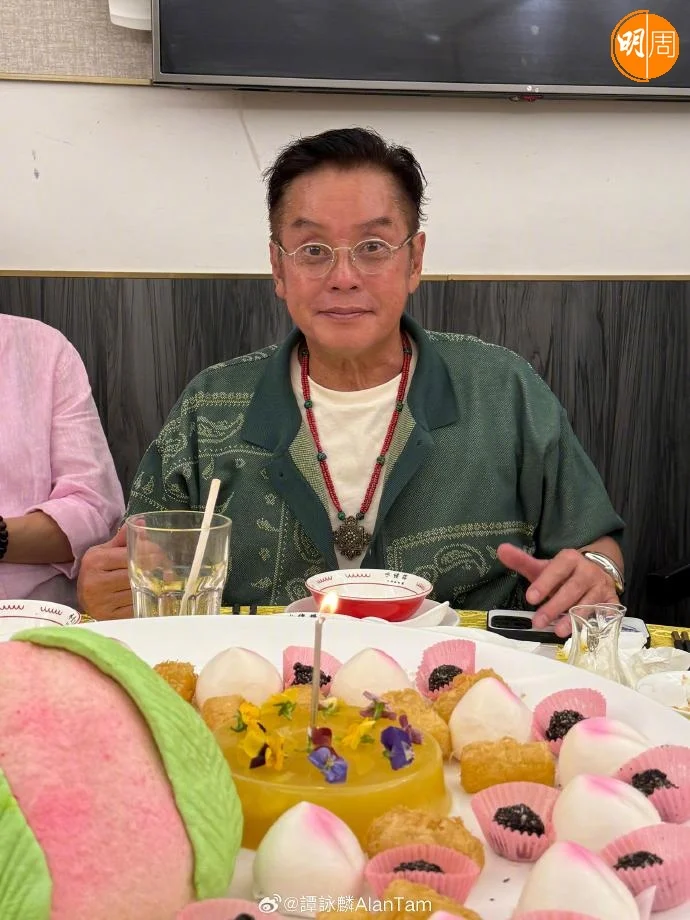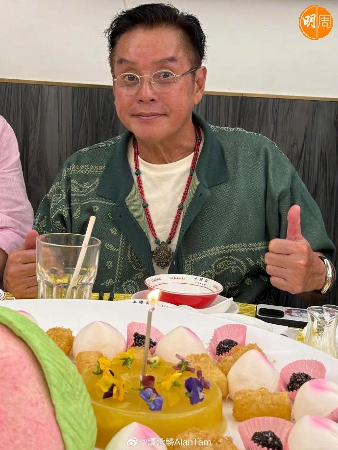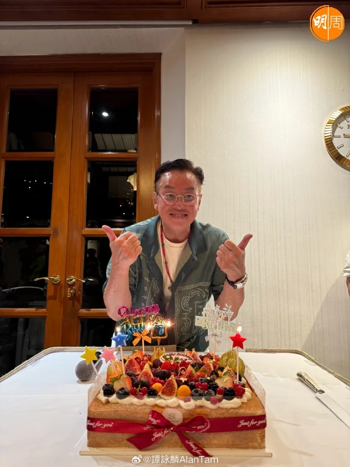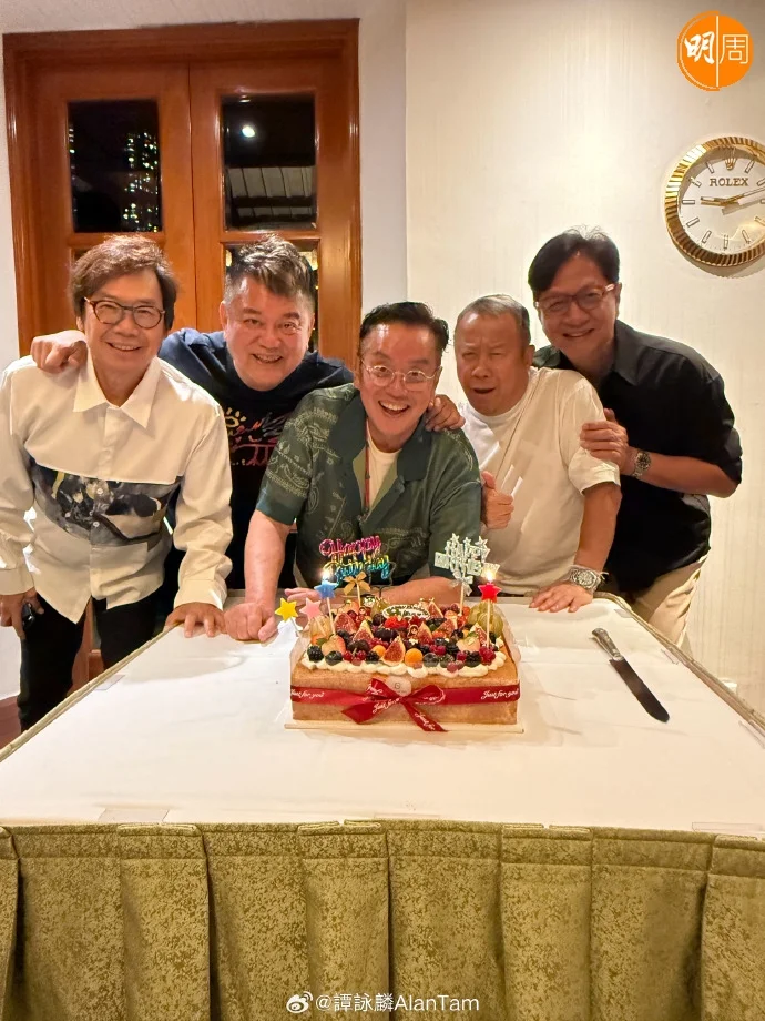 三兄弟的合照中,壽星公阿倫企中間,其中一張阿叻右手搭着阿倫膊,三人拎住紅酒杯面紅紅好開心;另一張阿倫換了衫,與阿叻和志偉在蛋糕前合照,阿倫雙手搭着二人並豎起2隻手指公,阿叻與志偉亦豎手指公,並齊齊與陳友、健仔、狄波拉等人大合照。