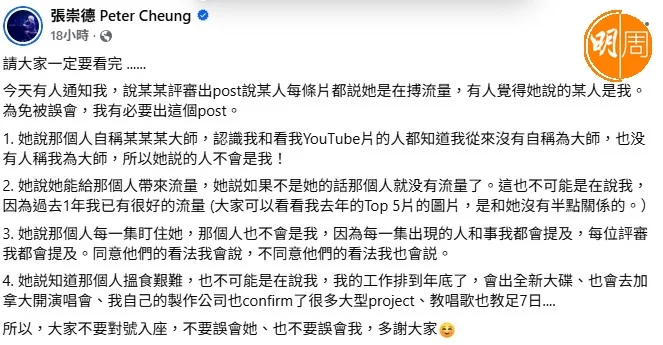 隨後張崇德在社交網發文澄清:「今天有人通知我,說某某評審出post說某人每條片都說她是在搏流量,有人覺得她說的某人是我。為免被誤會,我有必要出這個post。