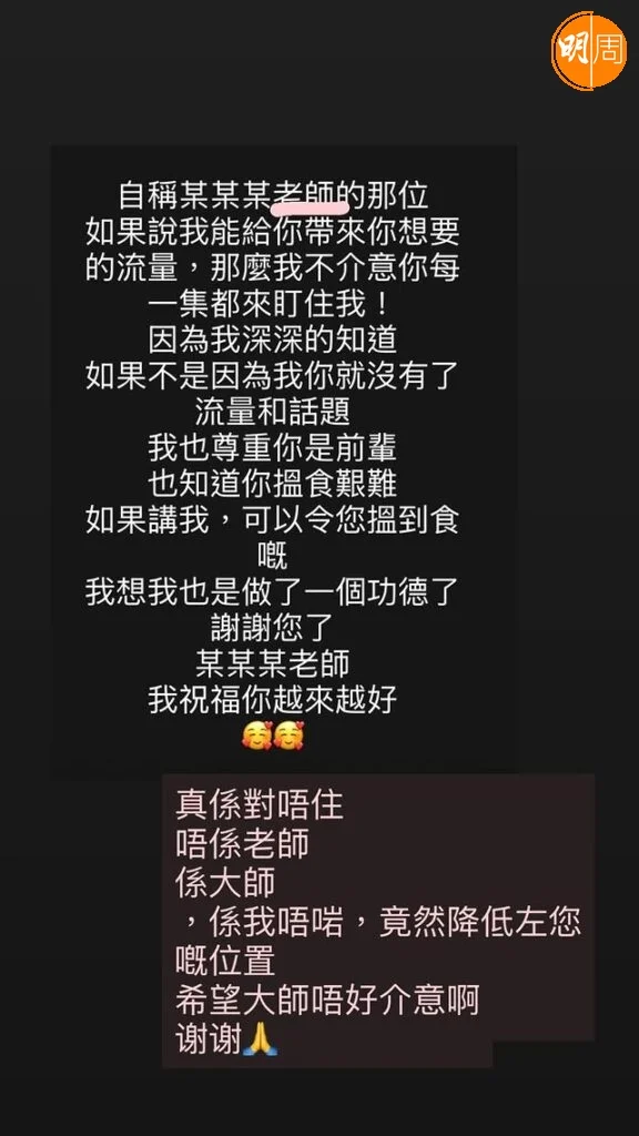疑似不滿被某位前輩緊盯的谷婭溦,昨日在社交網爆Seed,留言:「自稱某某某大師的那位,如果說我能給你帶來你想要的流量,那麼我不介意你每一集都來盯住我!因為我深深的知道,如果不是因為我你就沒有了流量和話題,我也尊重你是前輩,也知道你搵食艱難,如果講我,可以令您搵到食嘅,我想我也是做了一個功德了。謝謝您了,某某某老師,我祝福你越來越好」!並在帖文下留言補充:「其實我本不想講,但一次又一次,係覺得我好蝦?」