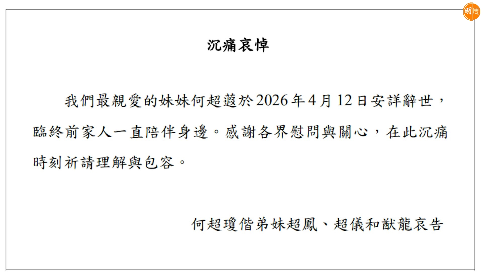 何超蕸的姊姊何超瓊、何超鳳、妹妹何超儀、弟弟何猷龍聯合發出家屬通告:「我們最親愛的妹妹何超蕸於2026年4月12日安詳辭世,臨終前家人一直陪伴身邊。感謝各界慰問與關心,在此沉痛時刻祈請理解與包容。」