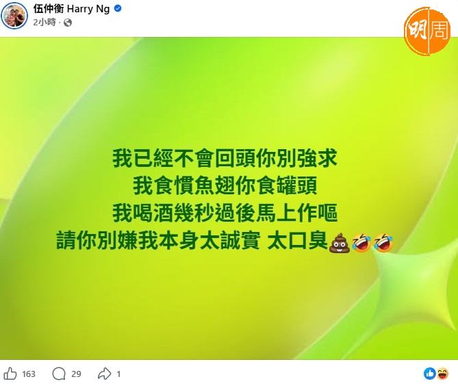 不過伍仲衡今日(7日)在社交網出Po,斬釘截鐵留言:「我已經不會回頭你別強求,我食慣魚翅你食罐頭,我喝酒幾秒過後馬上作嘔,請你別嫌我本身太誠實,太口臭」,當中有粉絲留言:「阿sir,你係一隻好馬,但如果真係有機會再做評判,我哋會有好多人捧你的,求下你,你做啦」!亦有人力撐他:「商業社會有乜所謂啱做就做!唔高興就唔做!」並有人借用歌詞笑指:「世事沒如果別再期盼如果,明明放低的你經已唱新歌」。