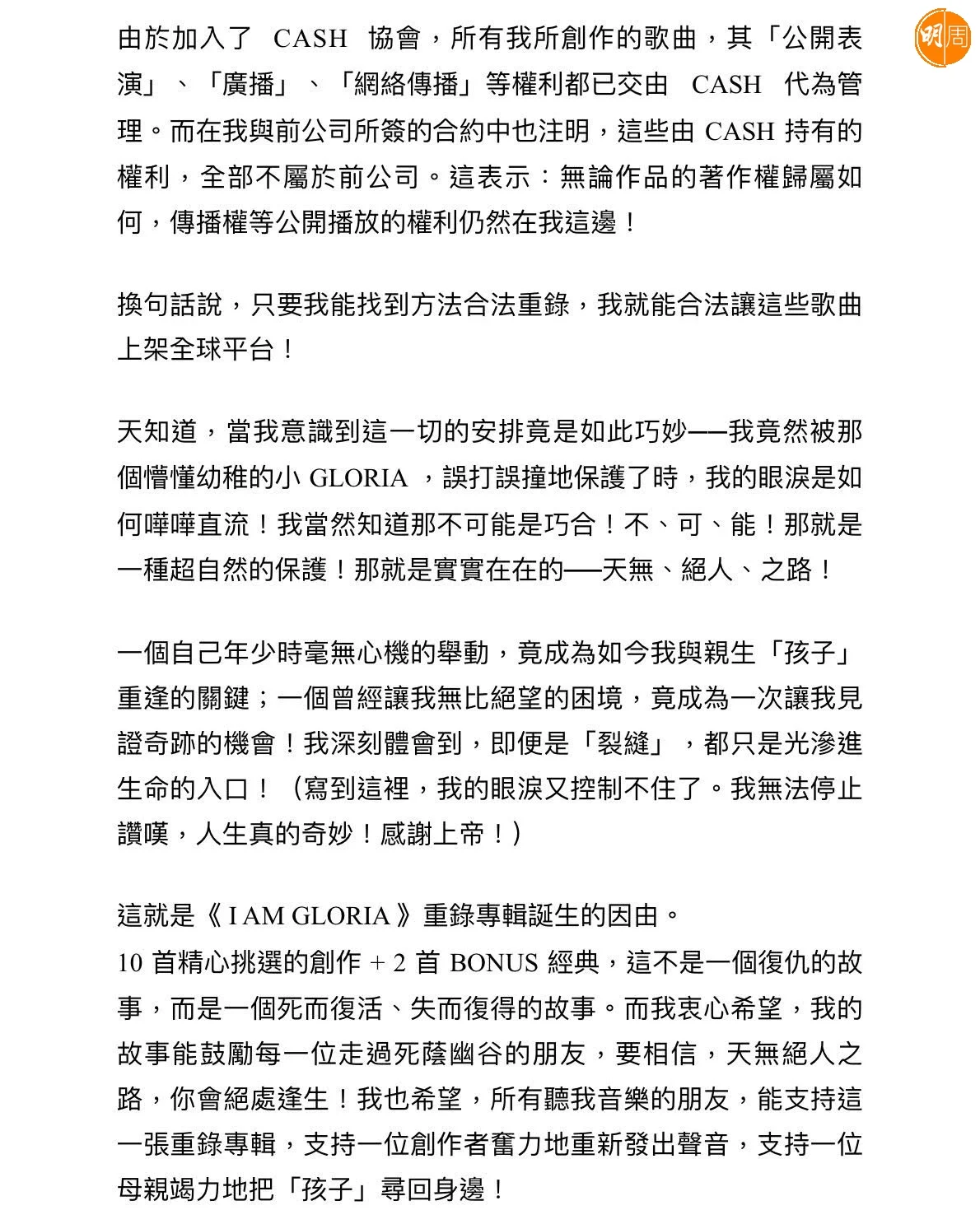 G.E.M.在留言簡述:「我與前公司的官司,已經打了超過六年。而誰能想到,我已經超過六年沒收到自己舊歌的版稅了?沒錯,六年版稅,一分沒有。所以今天我很高興宣布──我終於,重錄舊作了!『終於』?自己的舊作,重錄也這麼難?
