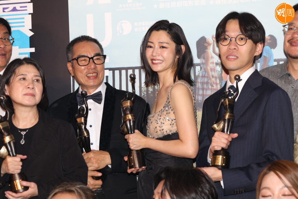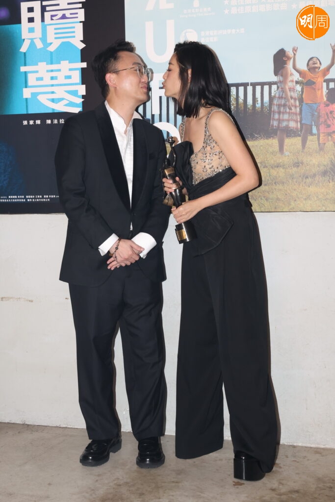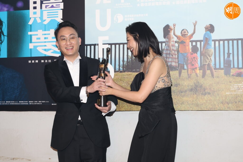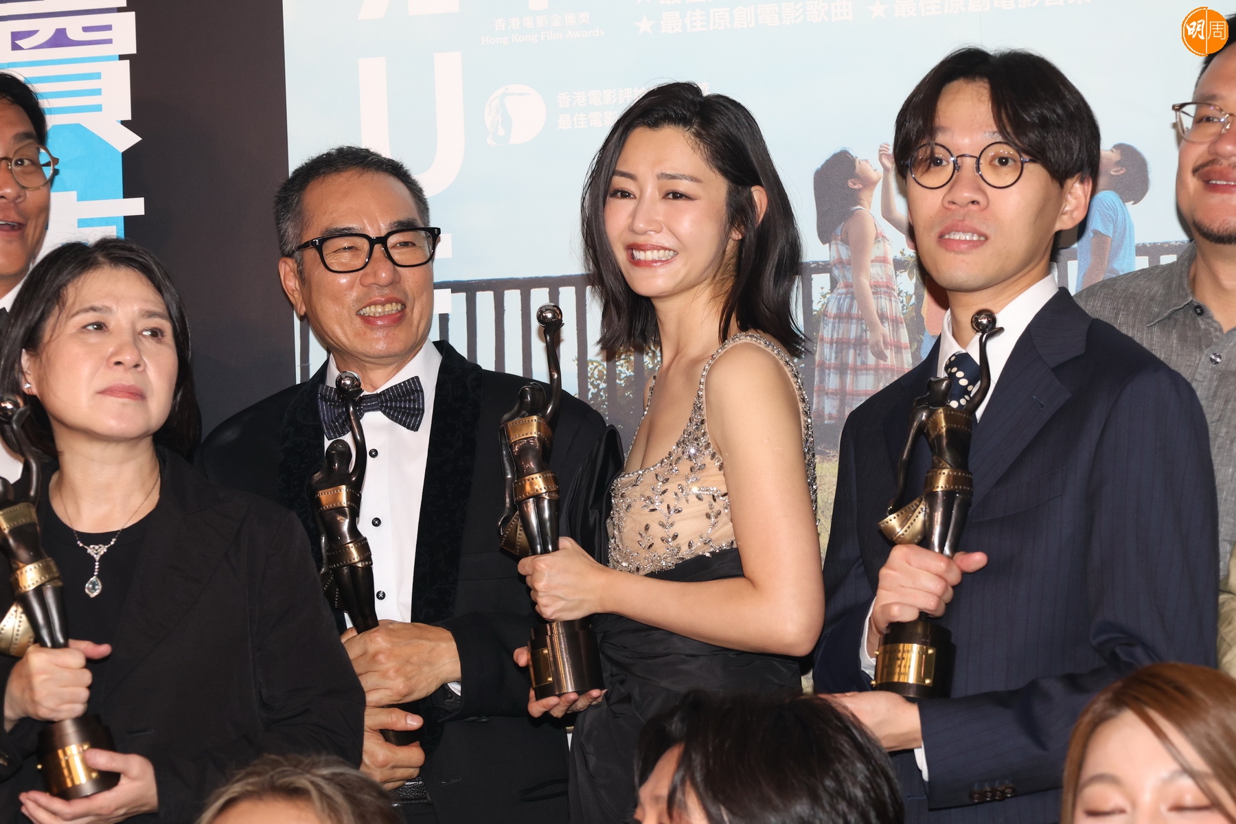 他更笑說:「幸好鏡頭只拍到那一刻,因為在之前,我其實伏在白只的肩膀上哭到顫抖,所以白只要回家換衣服。」問他有否被白只嫌棄?他笑謂:「沒有,他一直拍我大腿安慰我說『I know, bro』,因為我們樂隊朱凌凌成員和崔展鴻有很深交情,早在十八、十九歲時就開始了,真的沒錯!」黃淑蔓笑言見朱栢康哭得激動,還以為他被自己戲中的親情打動。黃淑蔓於九年前已憑電影《差一點我們會飛》奪得「最佳原創電影歌曲」,今次第二次提名,也成功攞獎,她笑說:「我覺得好勁,好似叫親糊都食糊咁!」說罷即更正不是這個意思,她是抱住感恩和榮幸的心,希望下次有機會可以自摸,自摸意思是可以包辦曲詞編監。