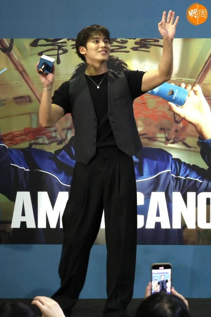 以一身黑色造型登場的Mingyu,即引起粉絲傳出尖叫聲,他特別用廣東話打招呼:「大家好,我係Mingyu from Seventeen!」知道有不少粉絲提早排隊霸位,他表示:「多謝大家的到來,我也覺得非常驚喜,我一直很想跟大家見面,見到大家好幸福。」問到拍攝廣告時的趣事,Mingyu稱在廣告中要用廣東話講「醒吓啦」和「唔該借借」,坦言覺得廣東話發音很難,隨後用溫柔語氣讀出廣東話對白,令粉絲瘋狂尖叫。
