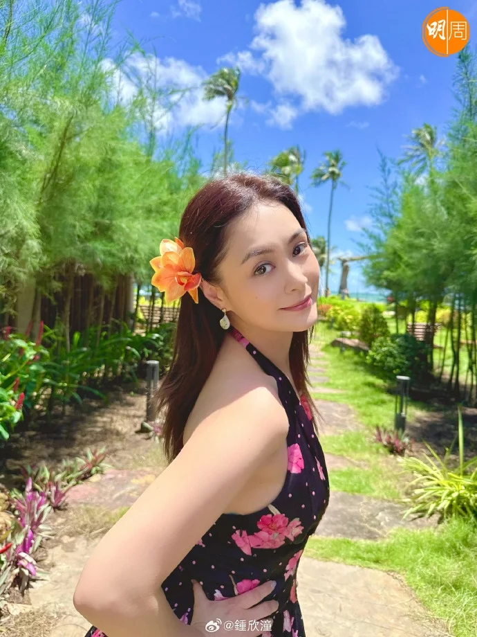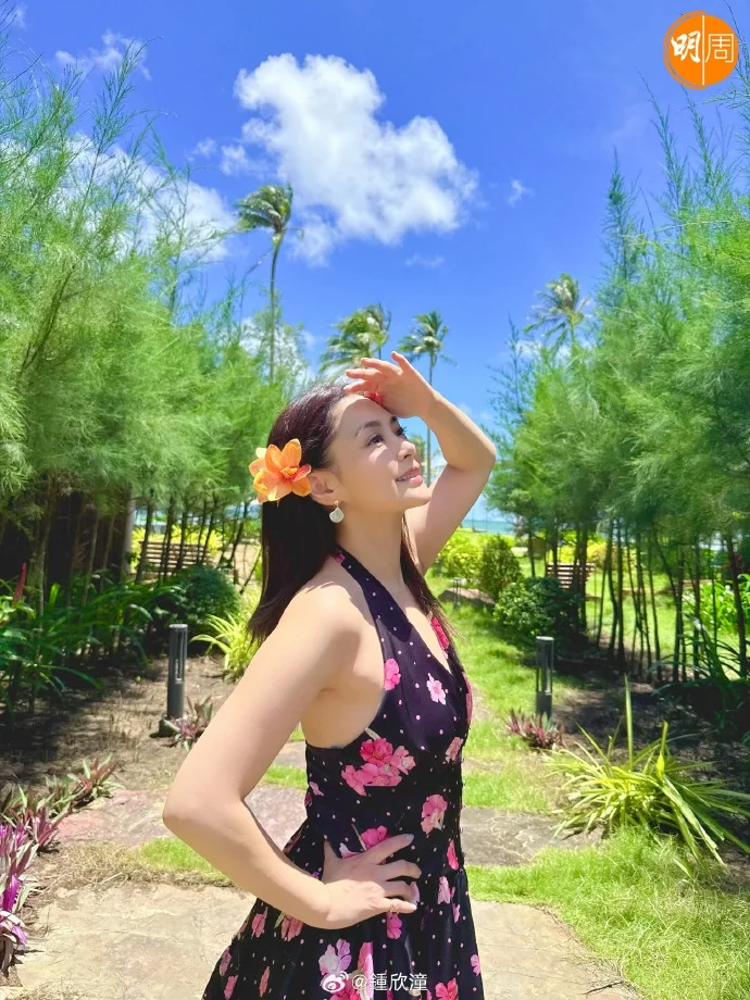 照片中包括穿上白色三點式在吊牀上享受陽光與海灘,又有穿低胸吊帶裙頭戴橙色鮮花在草地上的美照;最後是換上豹紋恤衫在夕陽沙灘上享美食,獲讚「景美人更美」。