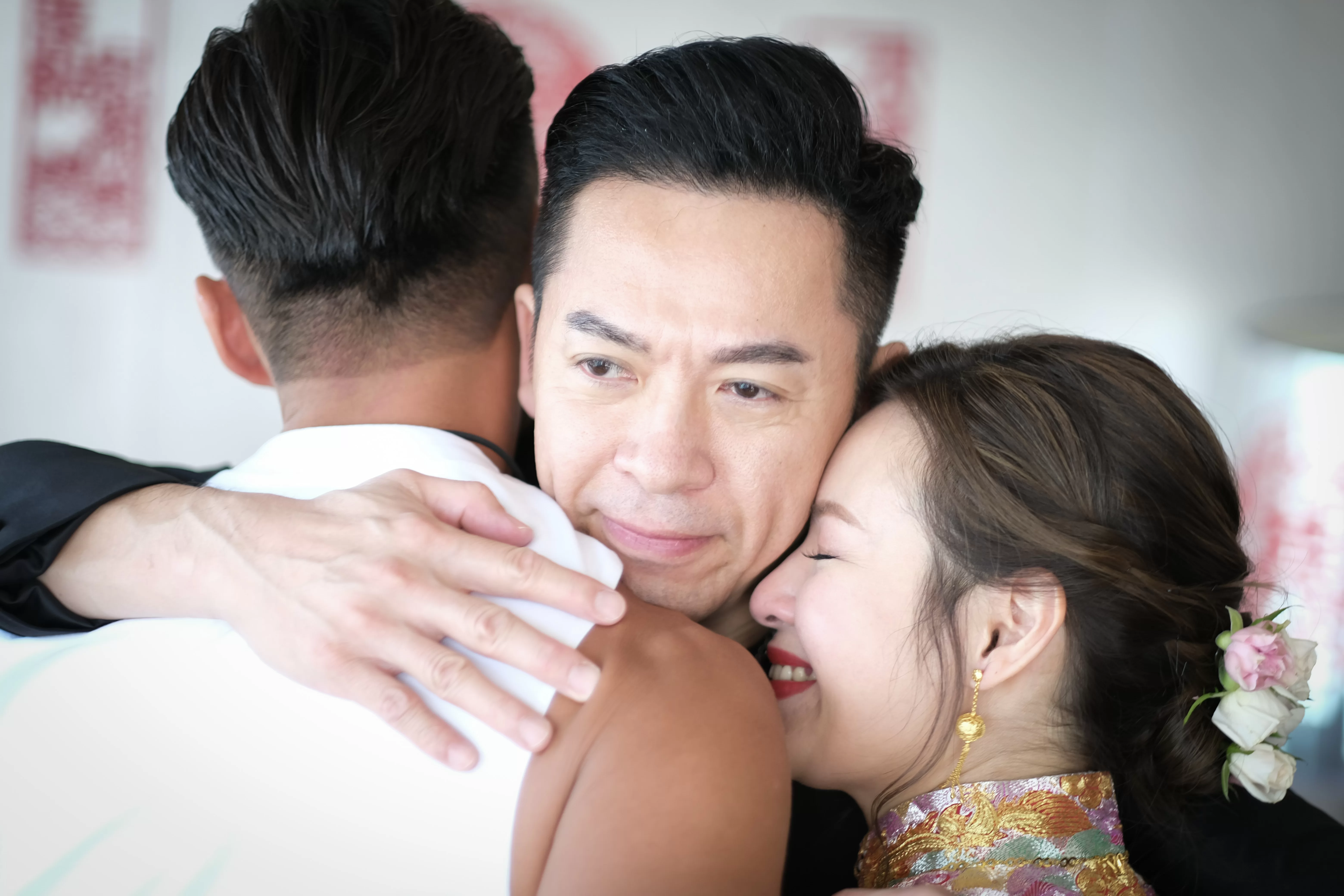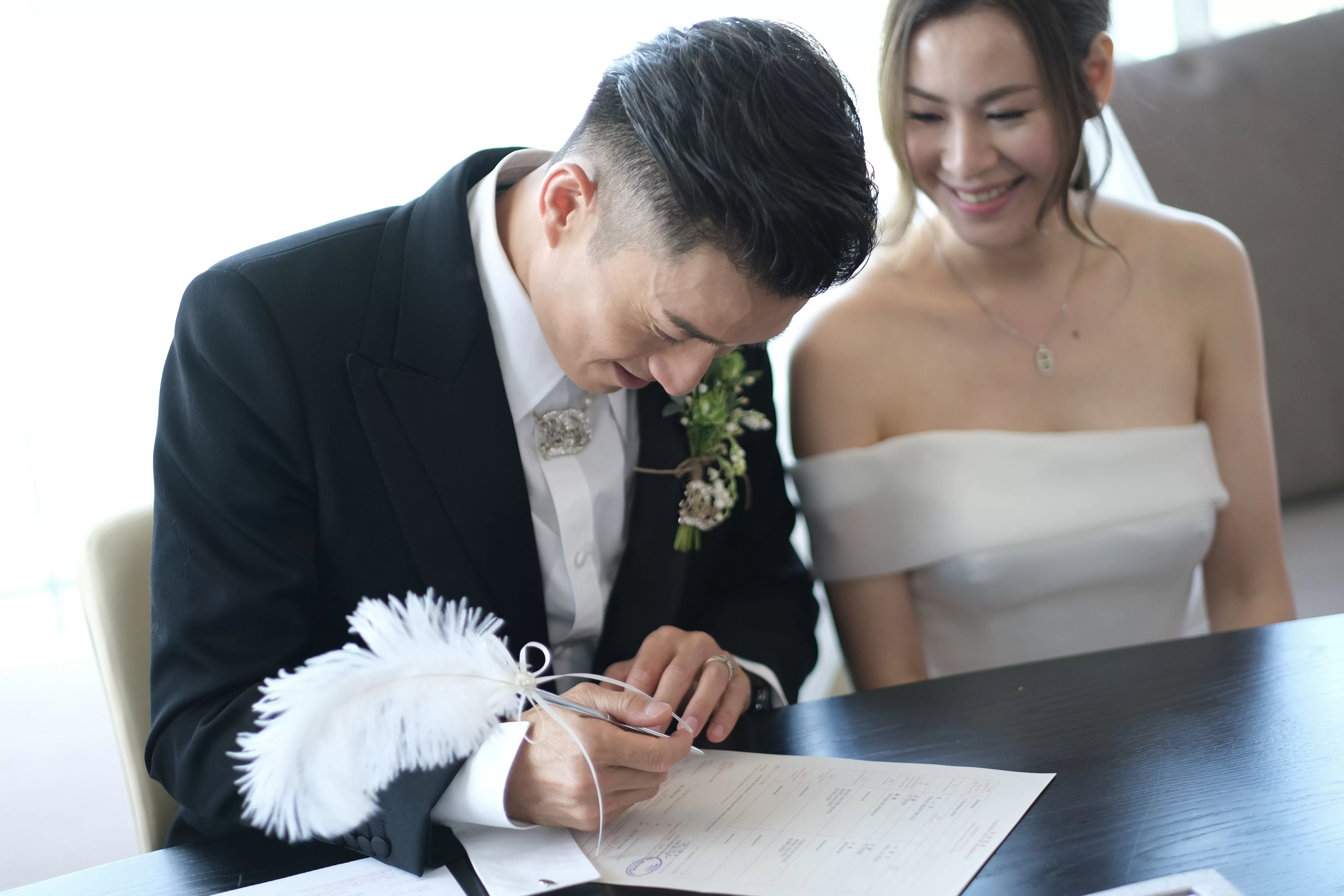 一對新人在雙方家長見證下完成註冊儀式,新郎哥在宣讀誓詞時,更感動得眼濕濕。最後,二人交換婚戒,開心地高舉香檳杯深情接吻。