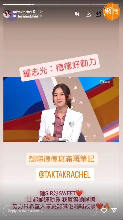 德德謙虛地一再感謝一眾同廠前輩說:「一定要多謝鍾sir(鍾志光)同King sir(鄭景亮)同咁多位專業評述,我每日都會觀察同睇佢哋點樣去做live同講比賽,因為每一位主持或者評述嘅風格都唔同,所以就可以吸收到唔同嘅嘢。我每日完咗廠,都會問番體育組、節目監製、導演、鍾sir 佢哋覺得我做成點,有冇咩要改善嘅地方;之後返到屋企會再睇番自己做嘅錄影,反思一下,例如支咪有冇攞得太高,或者比起其他主持我係咪太正經、唔夠放鬆。就算唔係我當值,我都會留意其他主持做成點,從中學習。」德德又感恩有觀眾撰寫長文為她加油。