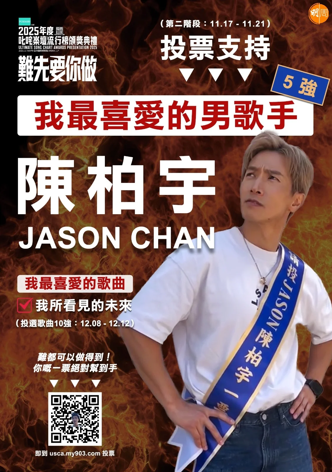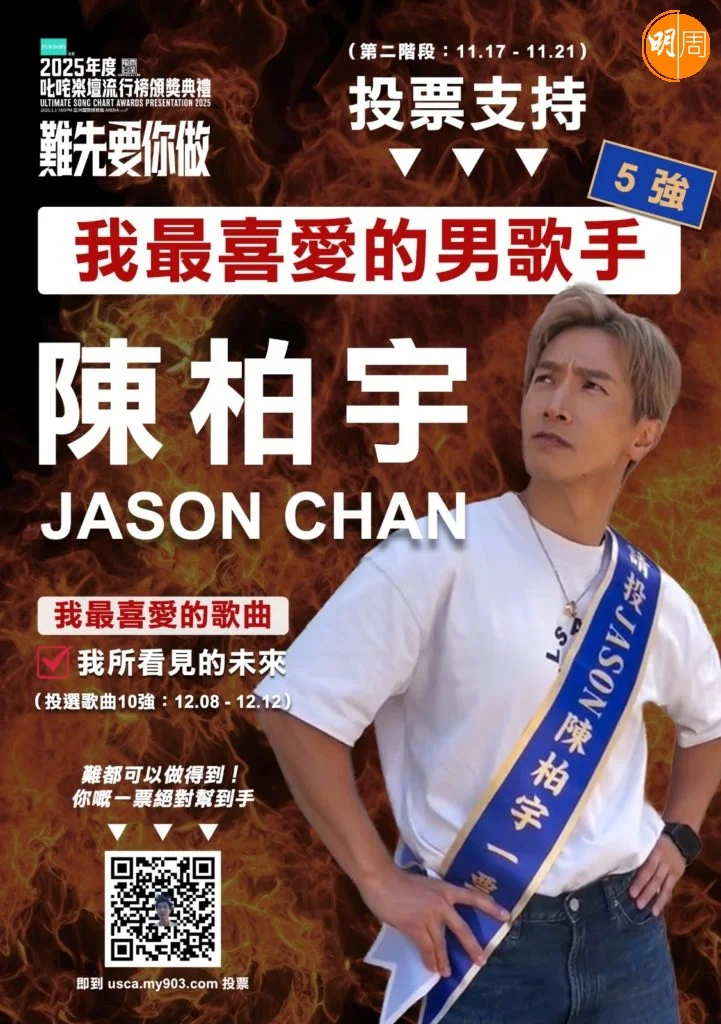 whatsapp-image-2025-11-21-at-4-22-31-pm陳柏宇(Jason)相隔6年再度晉身叱咤樂壇「我最喜愛的男歌手」十強。昨晚(20日)適逢投票截止前夕,Jason率領近百粉絲於旺角街頭拉票,場面聲勢浩大。