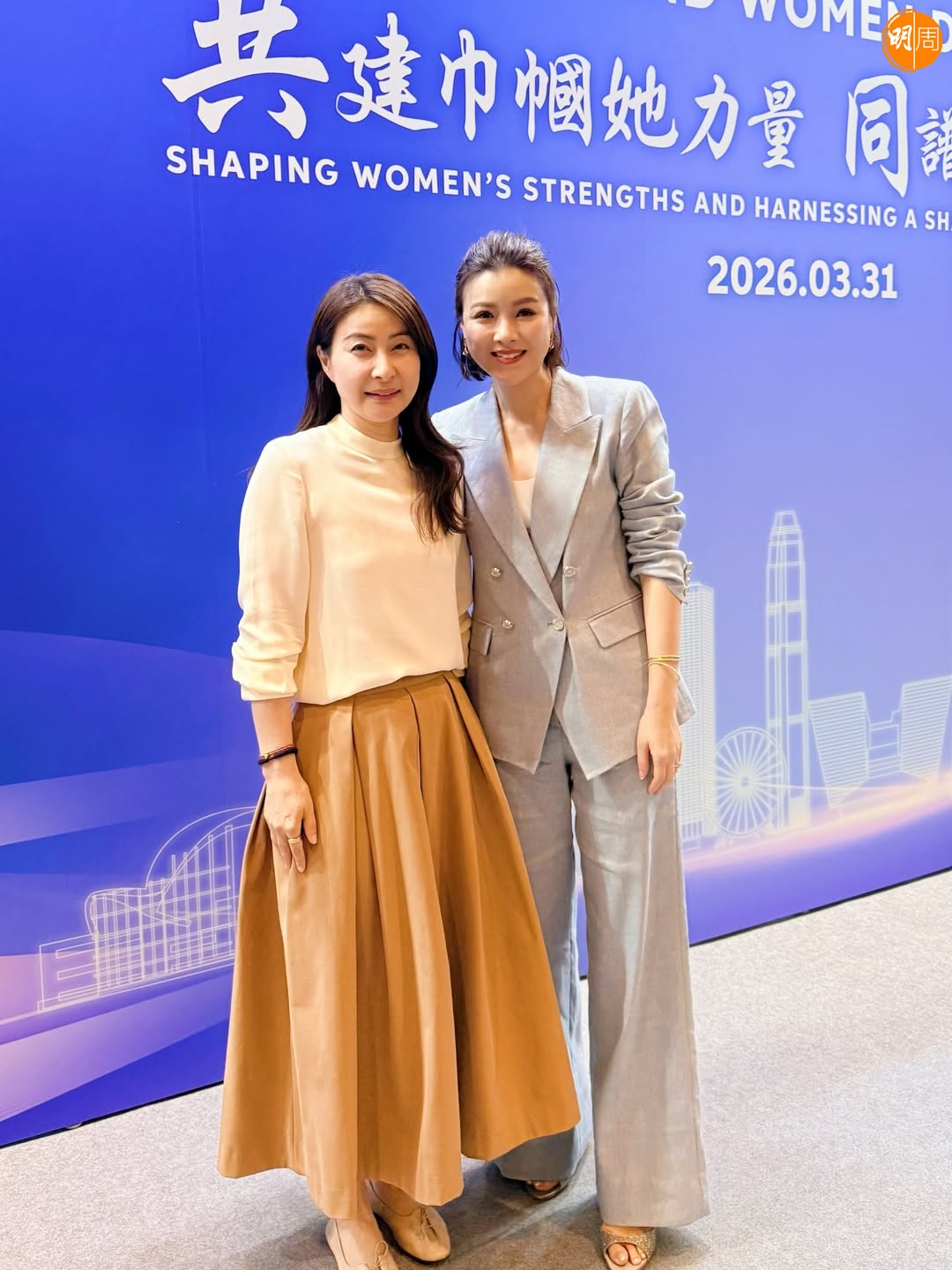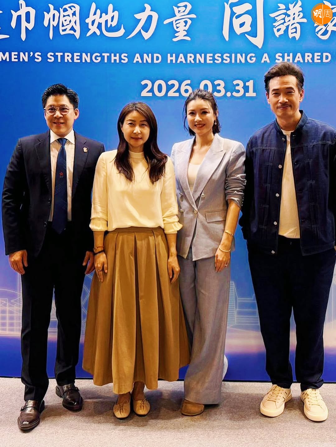 日前,Aimee與老公陳豪出席2026家庭暨婦女發展高峰會演講,同場還有朱玲玲大仔霍啟剛與太太郭晶晶。Aimee今日(3日)在社交網貼上在活動上跟郭晶晶及兩對夫婦的合照,除感謝大會的邀請,令她過了一個美好具意義下午外,還很很高興首次跟美麗的郭晶晶見面,一齊分享當爸媽的事。Aimee更大讚郭晶晶:「她就像我一直想像中一樣優雅和真誠。」