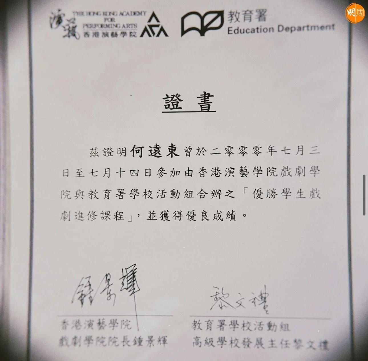 何遠東當年在香港演藝學院「優勝學生戲劇進修課程」中,獲得優良成績的證書,現在由學生變成導師,他希望薪火相傳,努力維繫着戲劇與新一代。