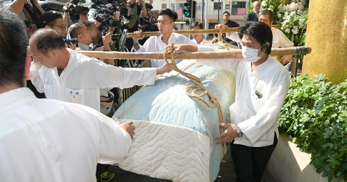 武俠小說泰斗查良鏞的出殯儀式,今早9時進行,前特首董建華、馬雲、蔡瀾、李純恩、劉天蘭、梁智鴻、陶傑、許鞍華、張紀中等陸續抵靈堂,送別查先生最後一程;10時45分,眾人開始離開殯儀館,蔡瀾、馬雲、陶傑等垂手肅立在靈車車尾,迎接查先生的靈柩,靈柩蓋了一幅淺藍色繡花布,兒子查傳倜捧着查先生的遺照,神情肅穆,站在車尾目送棺木上靈車後,跟李純恩及馬雲等人上了家屬專車,出發到寶蓮寺,查先生的靈柩會在寶蓮寺海薈塔火化,查大俠化作一縷輕煙,告別塵世!