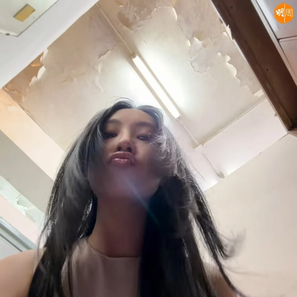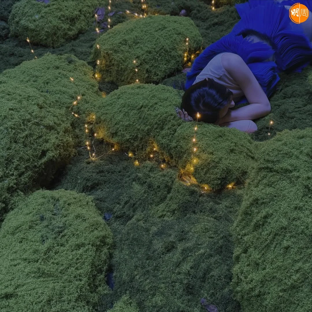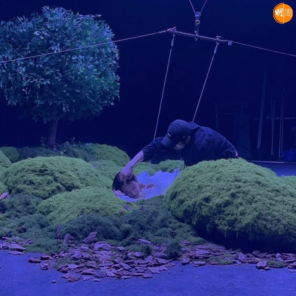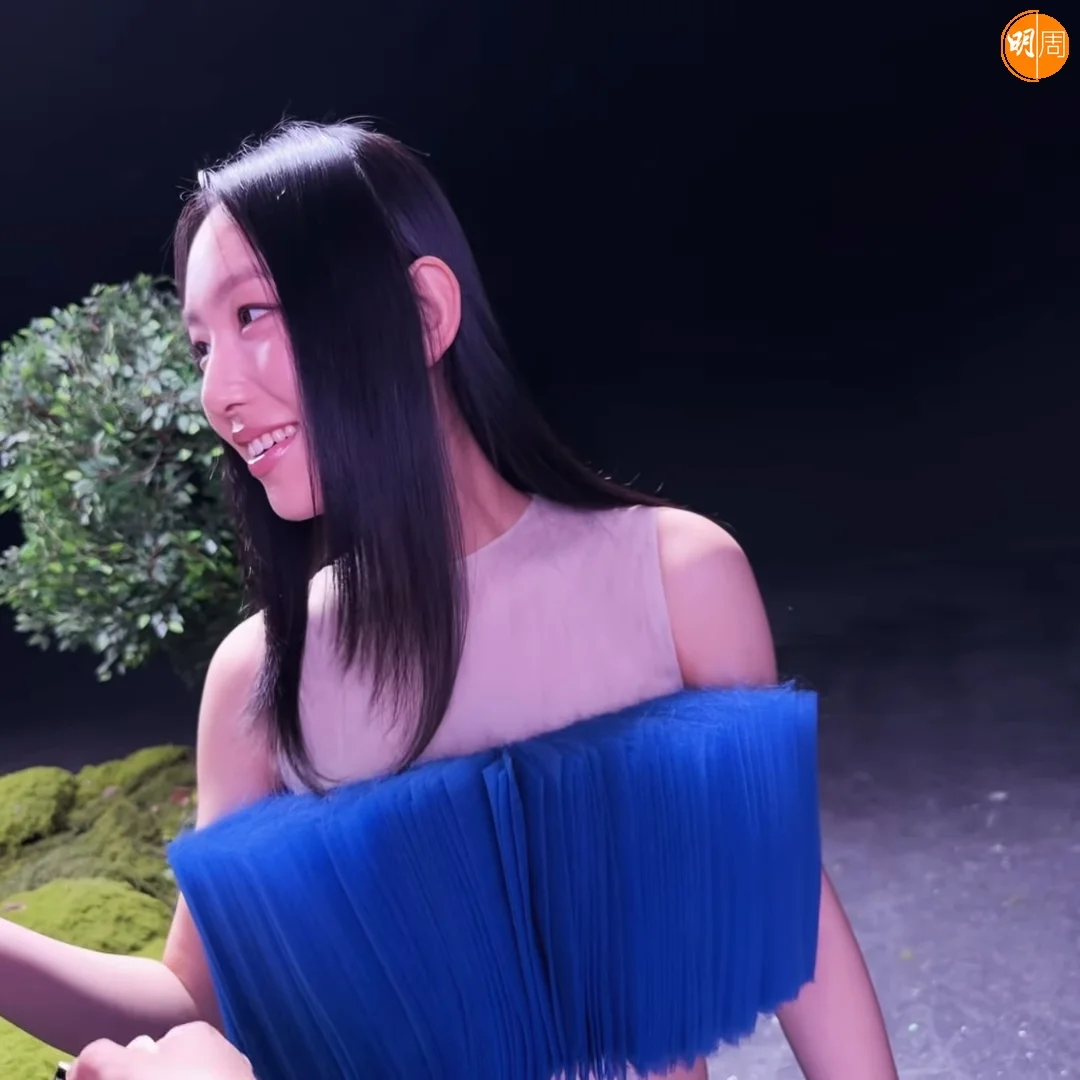 畫面中,她身著湛藍流蘇立體裙,在滿佈青苔的場景中轉換姿態;期間躺下時,指甲竟意外被苔飾纏繞,場面逗趣。隨後她換上一襲白色紗裙,為配合鏡頭「上天下海」,不僅親身上陣吊威也,更需投身水中拍攝。完成水中拍攝後,她笑問:「算唔算出水芙蓉?」盡顯鬼馬本色。而對於這身造型,Gigi亦自嘲道:「我覺得自己似一隻生蠔,但係佢哋話我似魷魚。」幽默比喻令現場氣氛更顯輕鬆。
