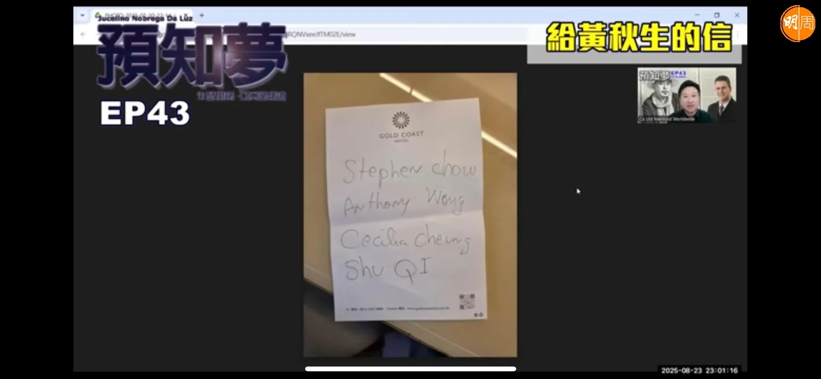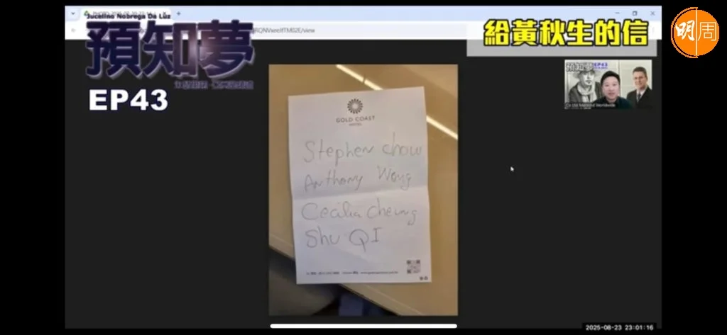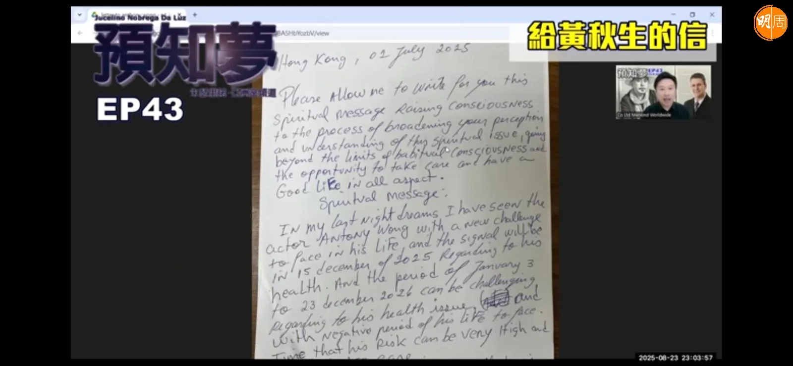 預知信是由教授手寫,當中提到:「我見到演員Anthony Wong將會遇到人生挑戰,這挑戰是關於健康方面問題,關於健康問題的一個徵兆,將會在2025年12月15日出現,他可能會感覺到究竟身體出了什麼問題。在2026年1月3日至12月23日這期間,他的健康狀況恐怕會受到嚴峻的挑戰,在這期間將會在他的人生出現一些負面狀況,他的健康風險相當高,希望他好好照顧自己。」教授也提到,希望他的預言會落空,但這確是他夢裏預見的。
