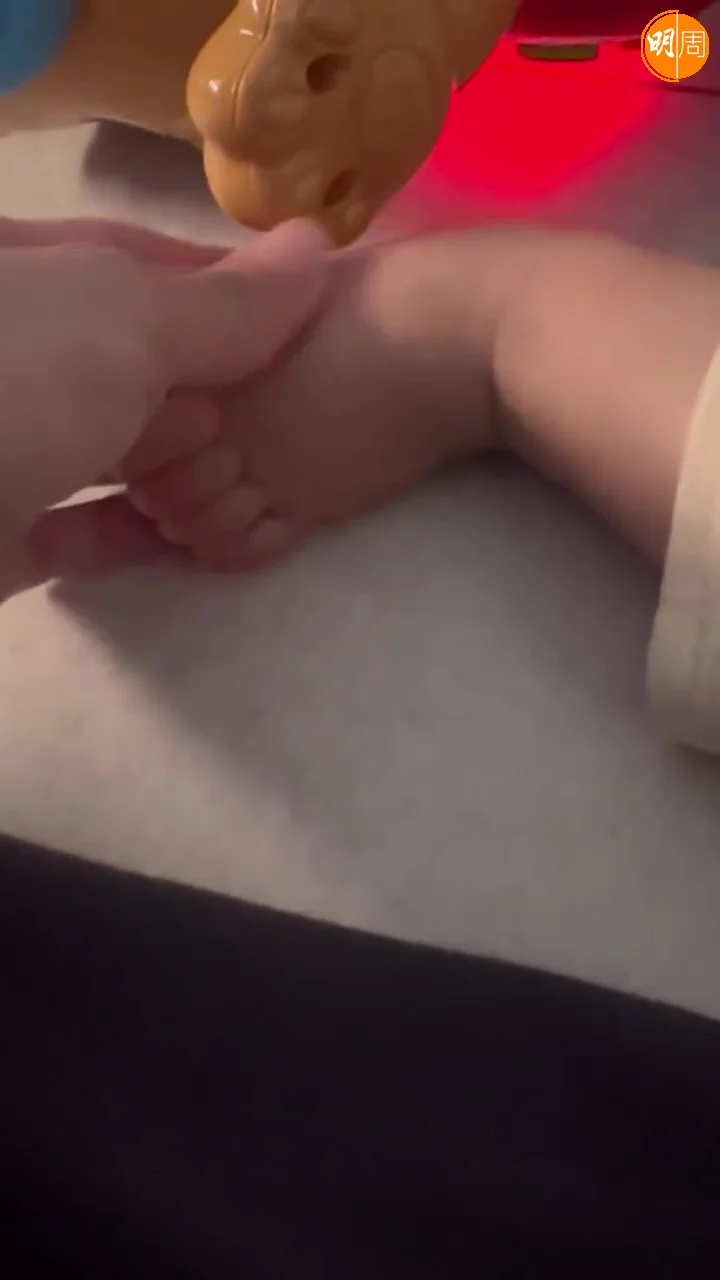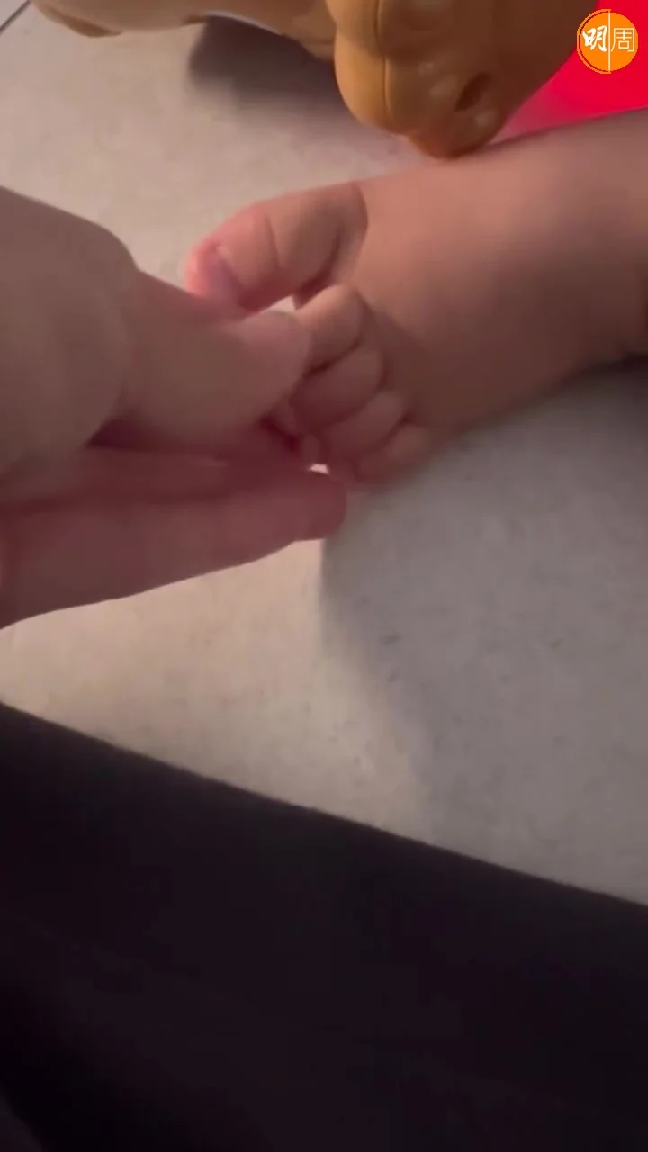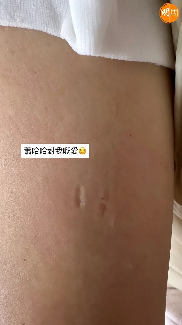 有子萬事足的翠如,今日(30日)在ig限時動態,貼上被「哈哈」咬了兩個牙仔印的照片,留言:「蕭哈哈對我嘅愛」,然後再來一條短片,是她輕撫着囝囝胖嘟嘟的腳趾仔,滿滿愛惜,但又被囝囝狠狠縮腳擺脫了。