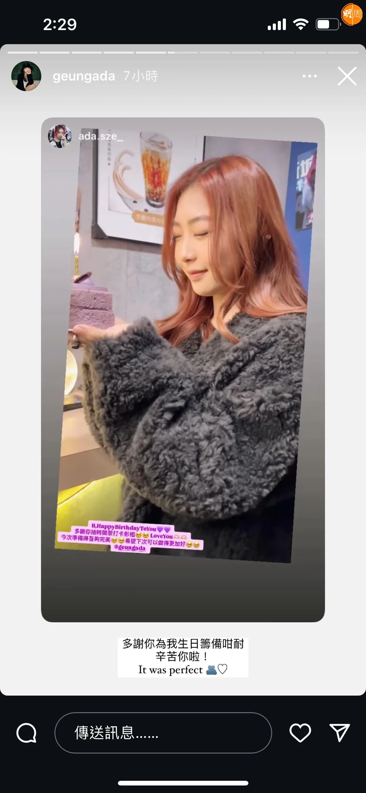 她又謂在生日應援上看到很多「新」面孔最令她開心,「見到有好多新面孔,但我問返佢哋,原來其實係舊面孔,係喺我之前參加比賽完嘅一個市集見過面,過咗咁多年之後,我成為女團,我生日,佢哋都特登到場送上祝福, keep住咁耐都有人支持我嘅感覺,呢一樣嘢令到我好開心!」