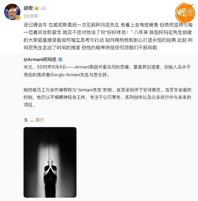 意大利時裝設計大師Giorgio Armani本月4日離世,享年91歲。中外眾星均發文悼念,包括章子怡、胡歌、陳法拉、薛芷倫等。