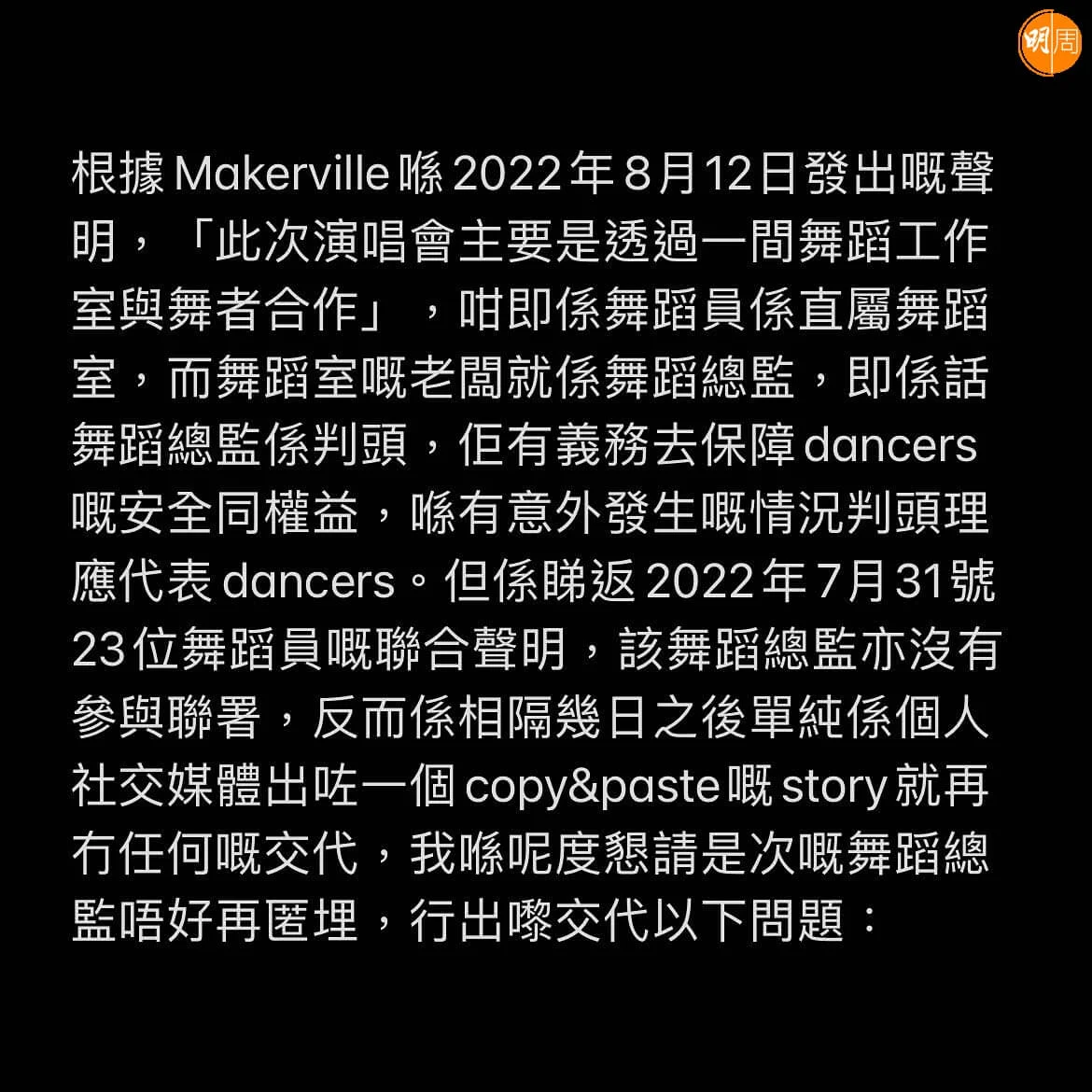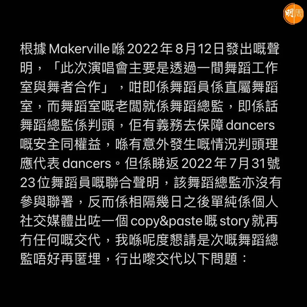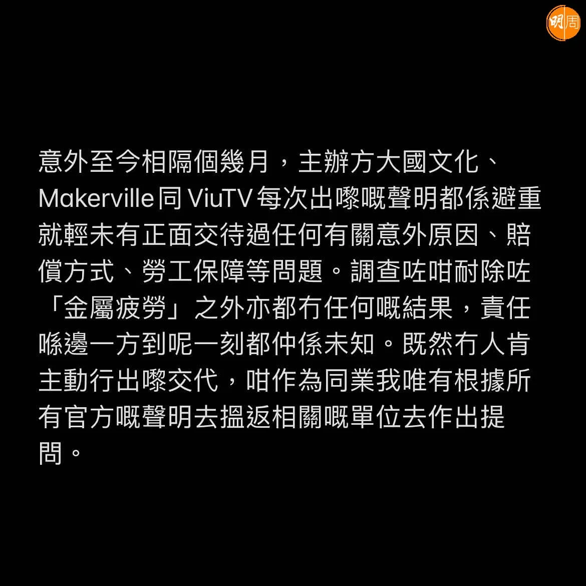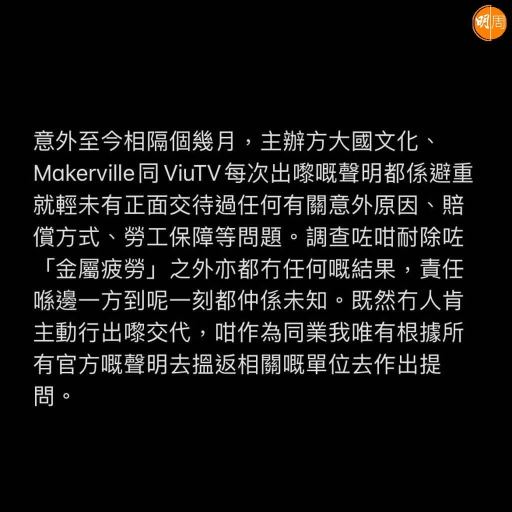 曾參與ViuTV節目《全民造星》的星級排舞師鄧駿銘 (Zero) ,昨天(6日)在社交網發文籲演唱會舞蹈總監方家諾(Rock Sir)勿再龜縮 ,又促管理層正面交代意外原因,Zero表示:「意外至今相隔個幾月,主辦方大國文化、Makerville同ViuTV每次出嚟嘅聲明都係避重就輕未有正面交代過任何有關意外原因、賠償方式、勞工保障等問題。調查咗咁耐除咗「金屬疲勞」之外亦都冇任何嘅結果,責任喺邊一方到呢一刻都仲係未知。」