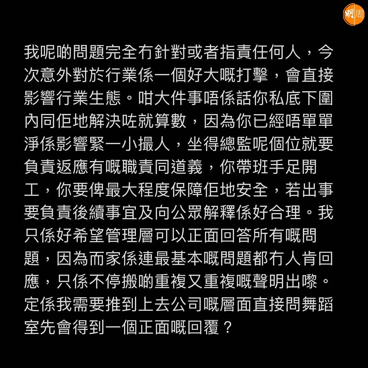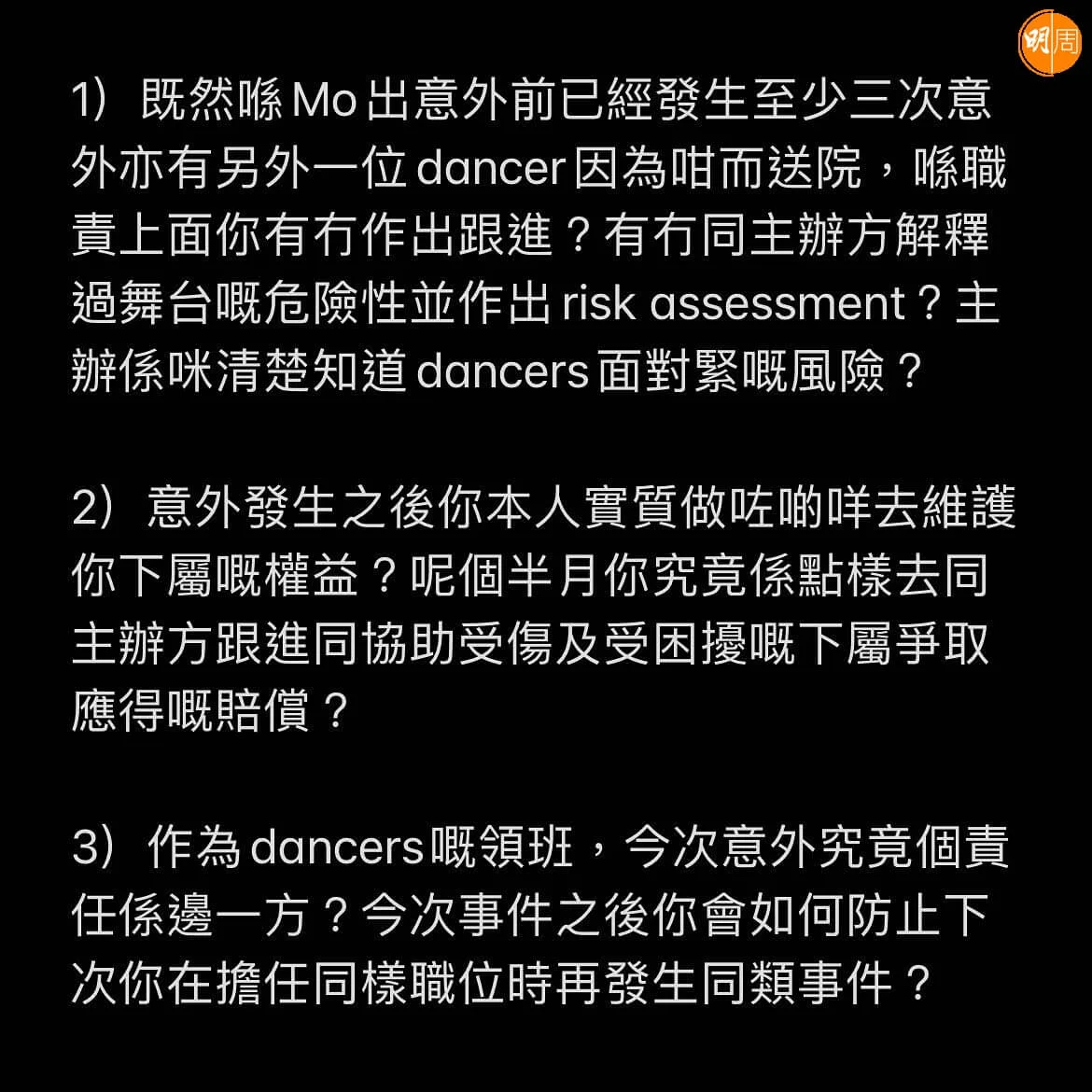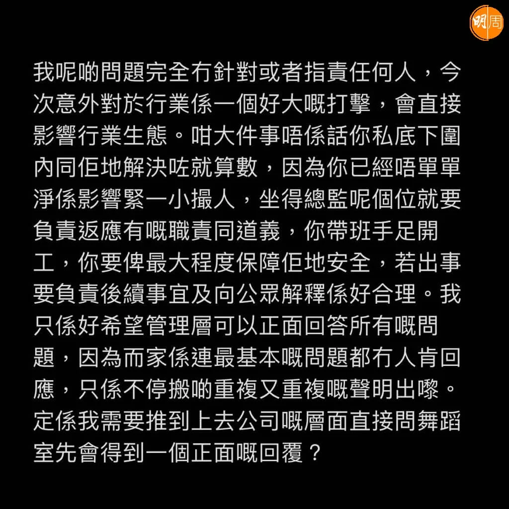 他對演唱會舞蹈總監Rock Sir提出三大提問,包括意外發生後的跟進措施、有否維護下屬權益並爭取賠償、如何防止同類事件再發生等,他表示:「我呢啲問題完全冇針對或者指責任何人,今次意外對於行業係一個好大嘅打擊,會直接影響行業生態。咁大件事唔係話你私底下圍內同佢哋解決咗就算數,因為你已經唔單單淨係影響緊一小撮人,坐得總監呢個位就要負責返應有嘅職責同道義,你帶班手足開工,你要俾最大程度保障佢哋安全,若出事要負責後續事宜及向公眾解釋係好合理。」