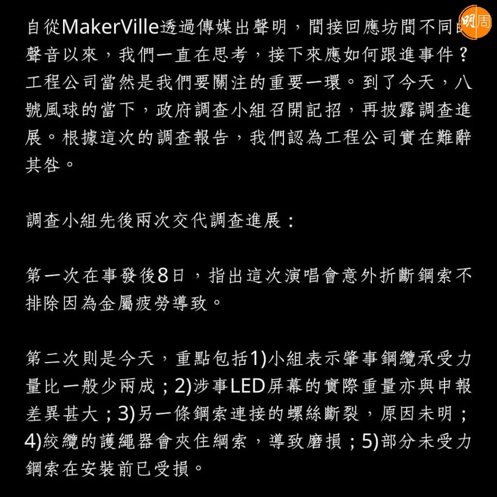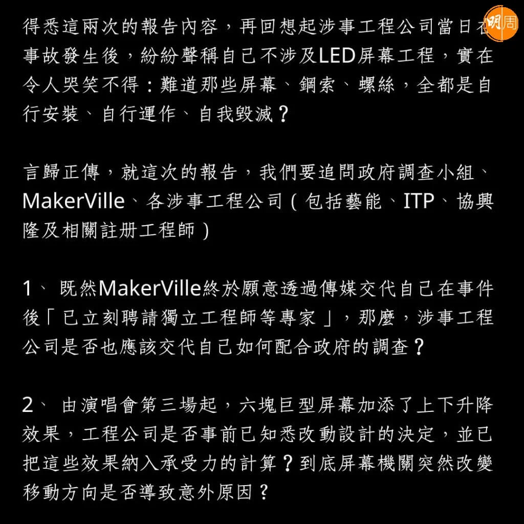 鏡粉在信件最後寫上︰「隨著報告內容公布得愈多,我們愈感困惑與憤怒:一個萬眾期待,佈置華麗的演唱會,其舞台工程竟然如此粗疏、輕率、馬虎,妄顧表演者的人身安全,如今想來,實在令人心寒。我們希望大家一起監察涉事工程公司、主辦方Makerville,以及政府調查小組的動態,別讓事件不了了之。」