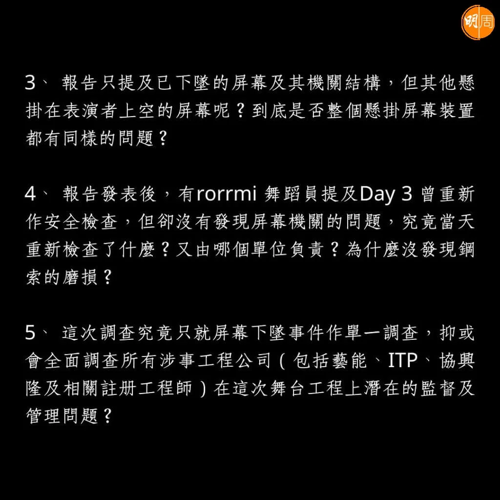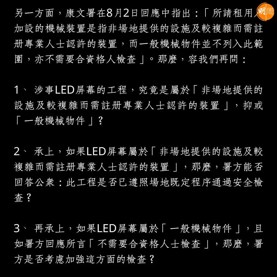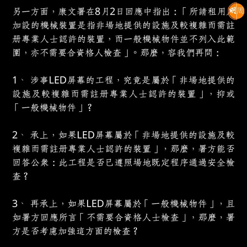 就康文署8月2日指出「所請租用人加設的機械裝置是指非場地提供的設施及較複雜而需註冊專業人士認許的裝置,而一般機械物件並不列入此範圍,亦不需要合資格人檢查」,鏡粉則列出3項問題追問,包括「涉事LED屏幕的工程,究竟是屬於『非場地提供的設施及較複雜而需註冊專業人士認許的裝置』,抑或『一般機械物件』」、「如果LED屏幕屬於『非場地提供的設施及較複雜而需註冊專業人士認許的裝置』,那麼,署方能否回答公眾:此工程是否已遵照場地既定程序通過安全檢查」、「如果LED屏幕屬於『一般機械物件』,且如署方回應所言『不需要合資格人士檢查』,那麼,署方是否考慮加強這方面的檢查?」