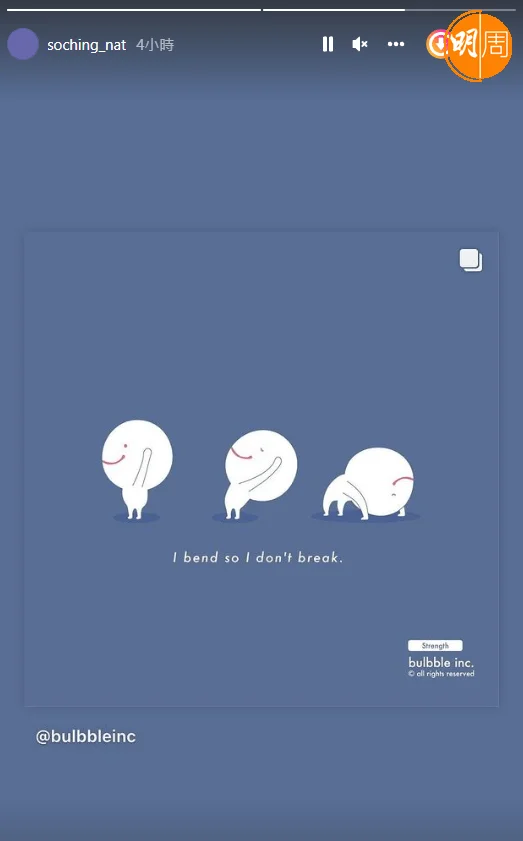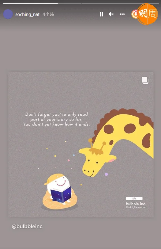 而早前曾放負表示無助的女友、COLLAR成員So Ching,隨阿Mo康復逐漸有進展後,似乎心情亦有好轉,今天(29日)她在社交網轉發兩張插畫,圖片寫上「Don’t forget you’ve only read part of your story so far. You don’t yet know how it ends.(不要忘記,到目前為止,你只閱讀了部分的故事。你還不知道結局會是如何)」另一張則寫上「l bend so l don’t break.(我折彎,所以我不會折斷)」暗示不會輕易放棄,保持正能量。