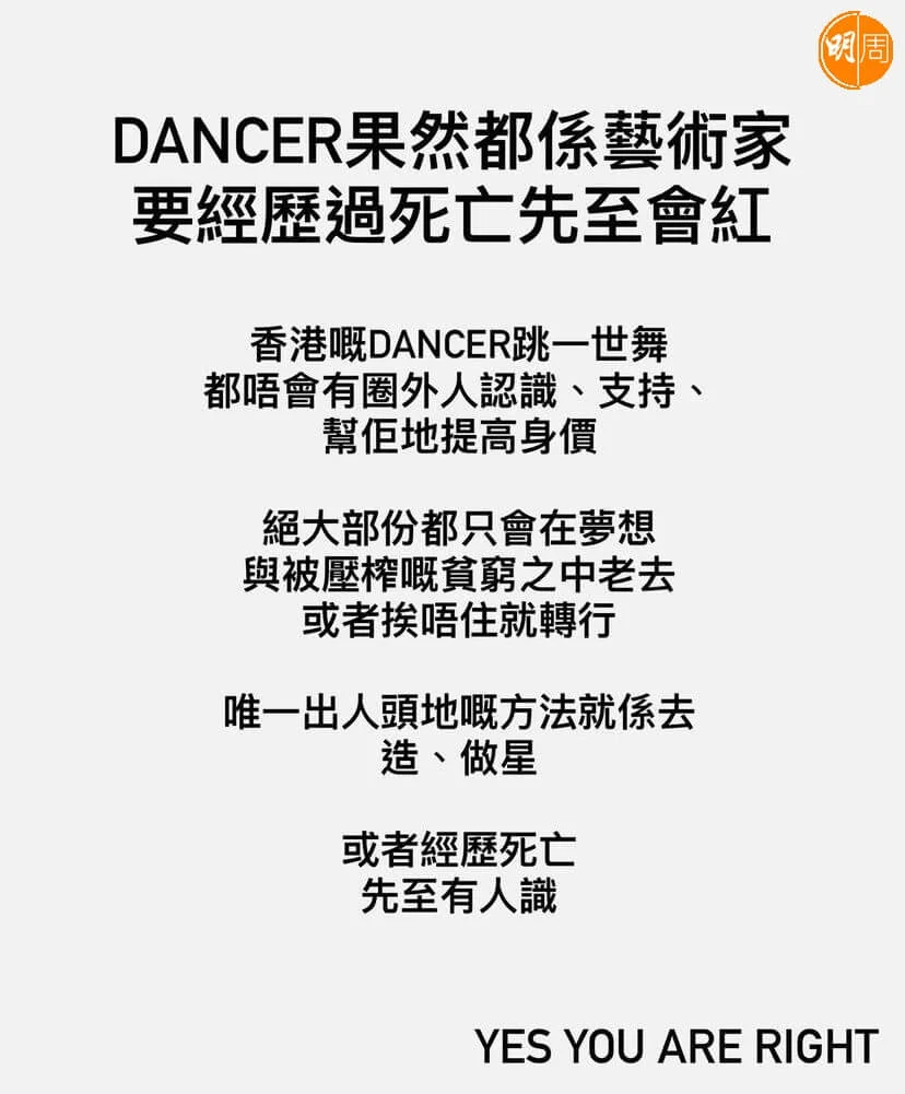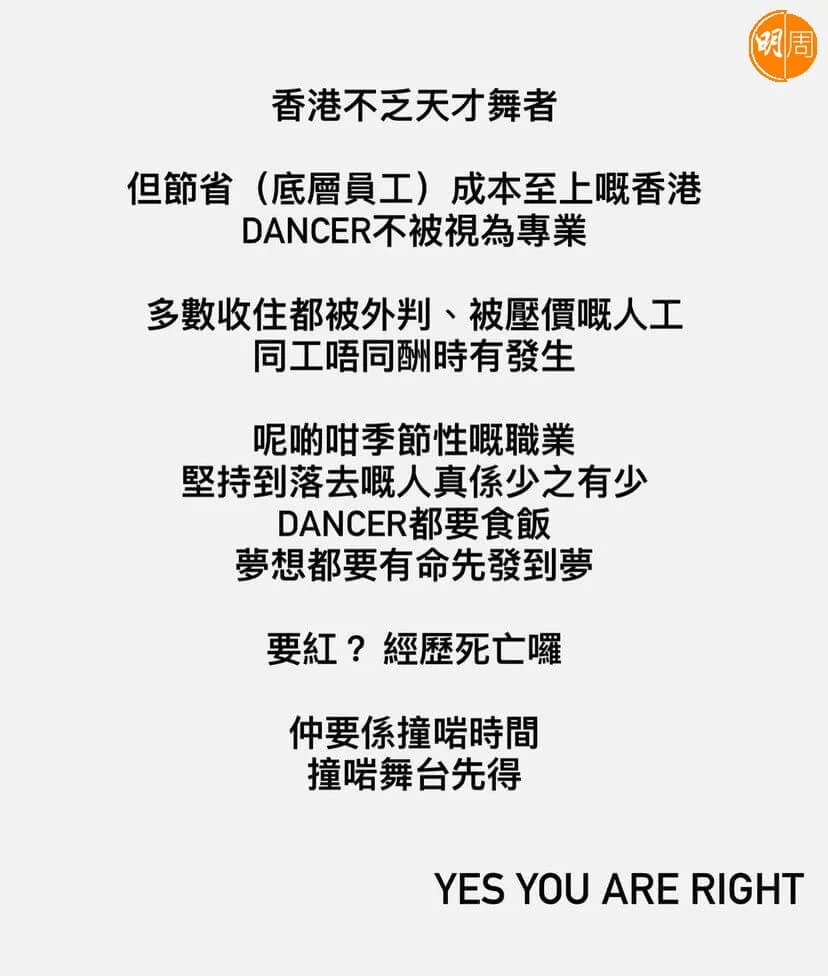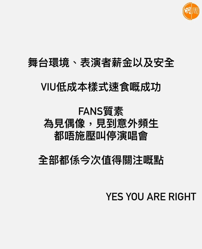 今天(10日)So Ching在社交網轉發了一則為香港舞蹈員發聲,並對舞者待遇感無奈的文章,寫上:「舞台環境、表演者薪金以及安全。VIU低成本樣式速食嘅成功,FANS質素,為見偶像,見到意外頻生,都唔施壓叫停演唱會,全部都係今次值得關注嘅點」,疑似為阿Mo及舞蹈員表達對公司的不滿。