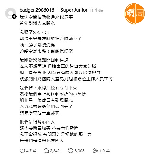 事後有自稱是當中一位受傷歌迷出Po,表示已照了X光、CT都沒事,只是左腳很痛暫時動不了,頭和脖子都沒受傷,已從醫院離開回到住處,並透露厲旭在醫院等候他們:「本來不想再說 ,但這事真的希望大家知道。旭一直在等我,因為只有兩人可以陪同檢查,沒想到回到醫院大堂見到旭和幾位工作人員在等。我們掉下來後旭源(厲旭和始源)有立刻下來,然後我們馬上被送到附近的小醫院,旭和另一位成員有到場關心。本以為轉院後他們就回去了,結果原來旭一直都在。」