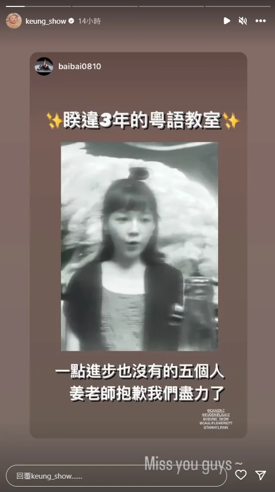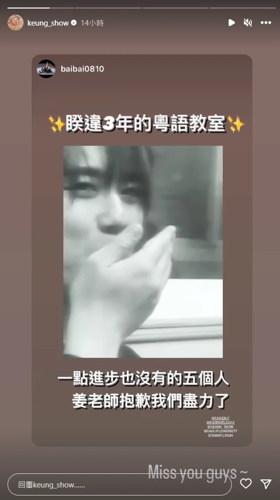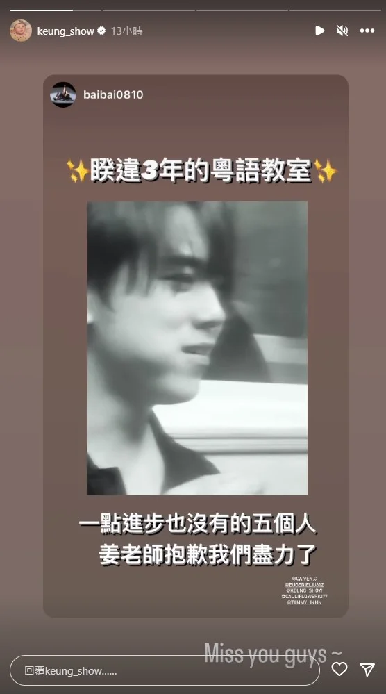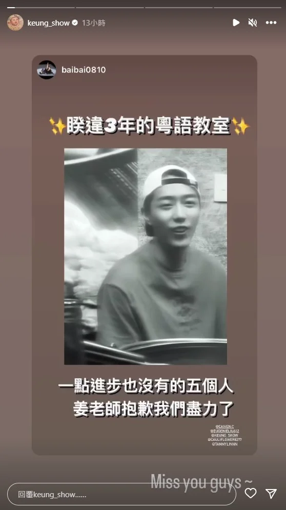 之後,姜濤在IG限時動態上載晚飯照片,寫下:「Hello Taiwan~六小福們在哪裡?」他更在晚飯時教「六小福」講廣東話,好搞笑!當中提到的「六小福」,原來就是姜濤曾在20年赴台參與拍攝的台灣校園電視劇《超感應學園》,同劇演員包括蔡凡熙、劉奕兒、林思廷、洪群鈞和百白主演,六人在劇中組成的「六小福」。