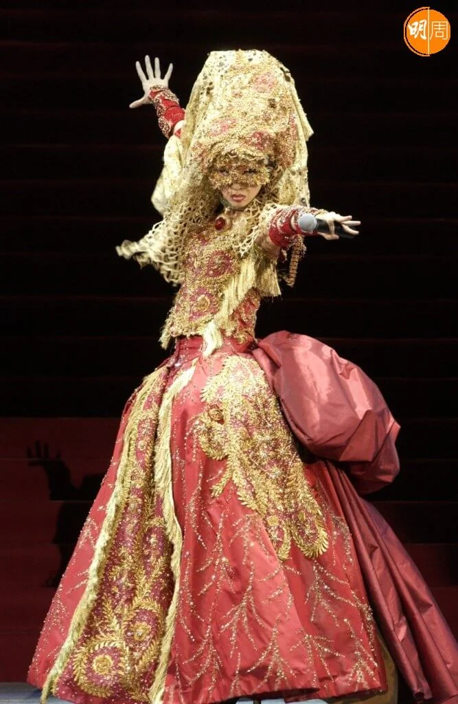 開場的宮廷服,用紅色真絲緞作骨幹,全套衣服繡金線、釘寶石和釘珠子,連頭飾、面罩,還有裙內小小的打底褲,全手工,出動了多位師傅,趕工三個多星期才完成;配上金色長靴,隆重而耀目。